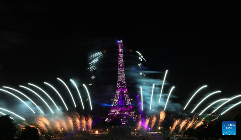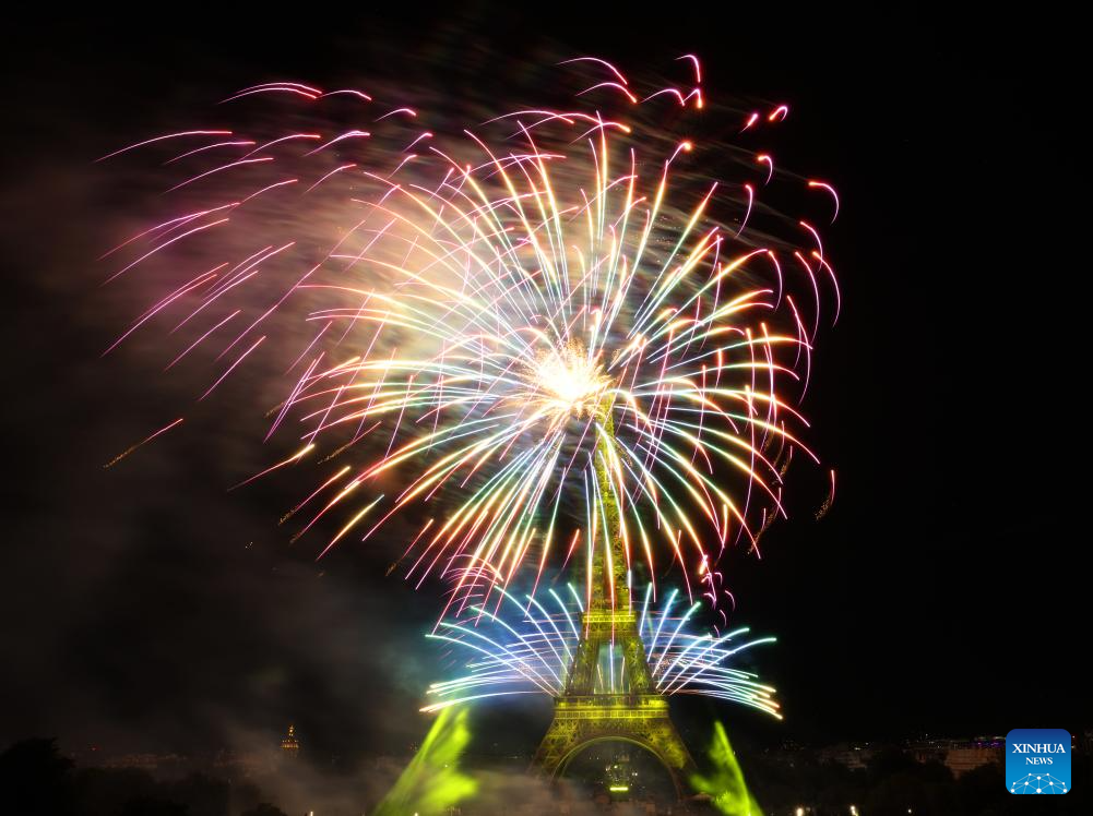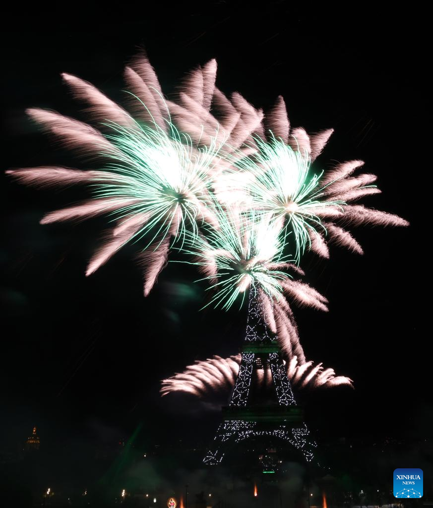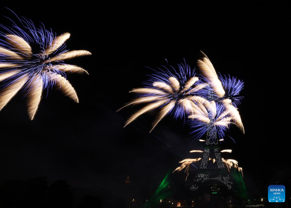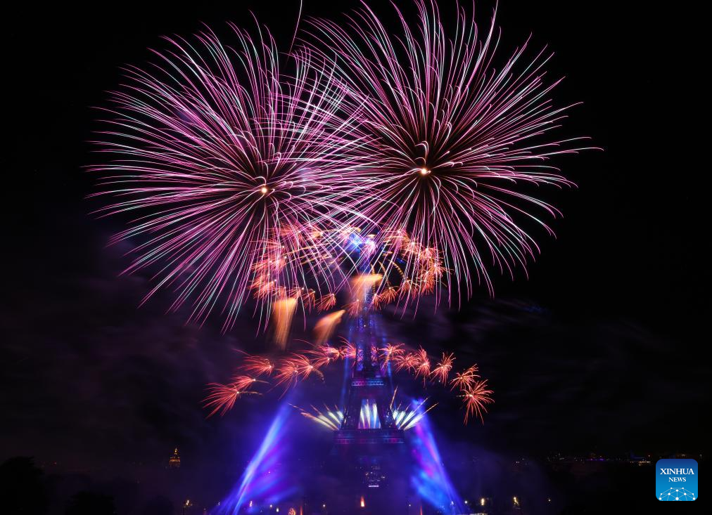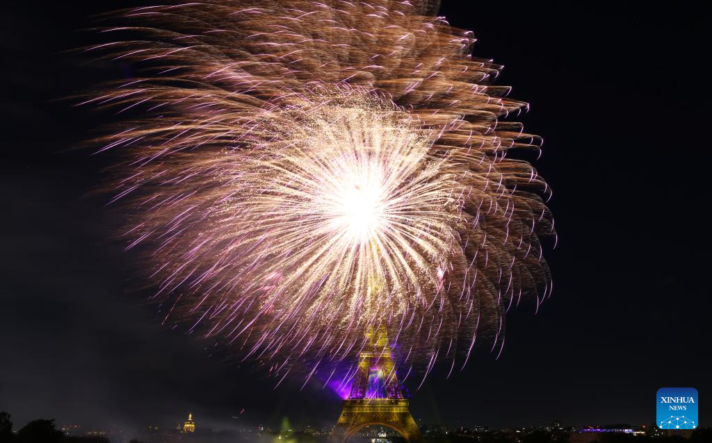 Fireworks explode near the Eiffel Tower during the Bastille Day celebrations in Paris, France, July 14, 2023. France held the celebrations of the French National Day, or Bastille Day, on Friday. (Xinhua/Gao Jing)