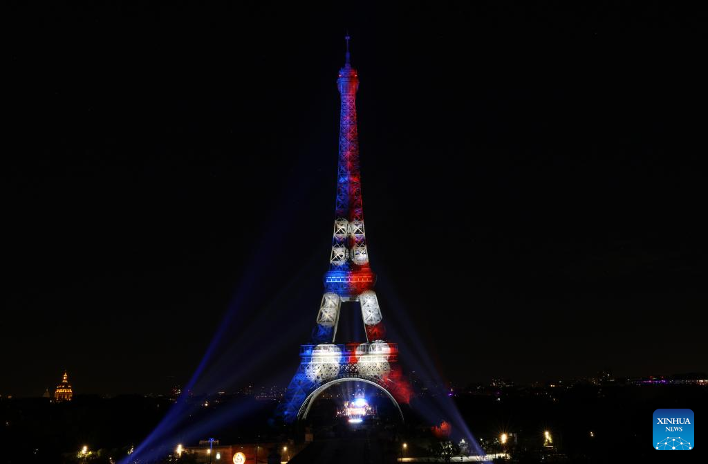 The Eiffel Tower is lit with red, blue and white during the annual Bastille Day celebrations in Paris, France, July 14, 2023. France held the celebrations of the French National Day, or Bastille Day, on Friday. (Xinhua/Gao Jing)
