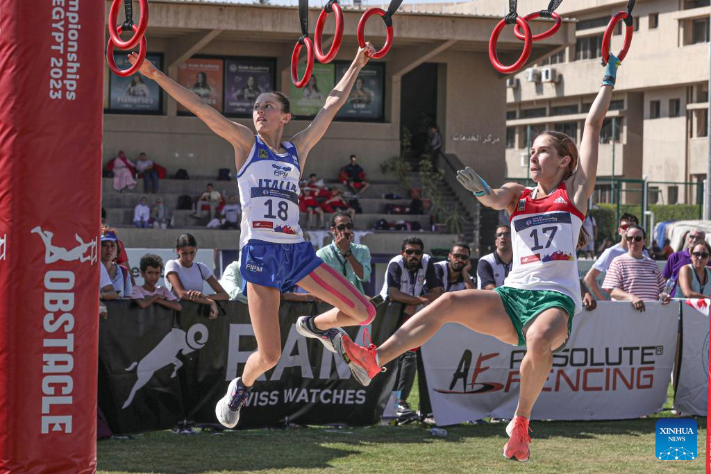 Annachiara Allara of Italy (L) competes with Linda Rharaszin of Hungary in obstacle race during the women's final of the UIPM 2023 U17 World Championships in Alexandria, Egypt, July 15, 2023. (Xinhua/Ahmed Gomaa)