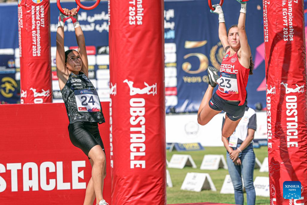 Mohamed Sarah of Egypt (L) competes with Alexandra Fernandes of the Czech Republic in obstacle race during the women's final of the UIPM 2023 U17 World Championships in Alexandria, Egypt, July 15, 2023. (Xinhua/Ahmed Gomaa)