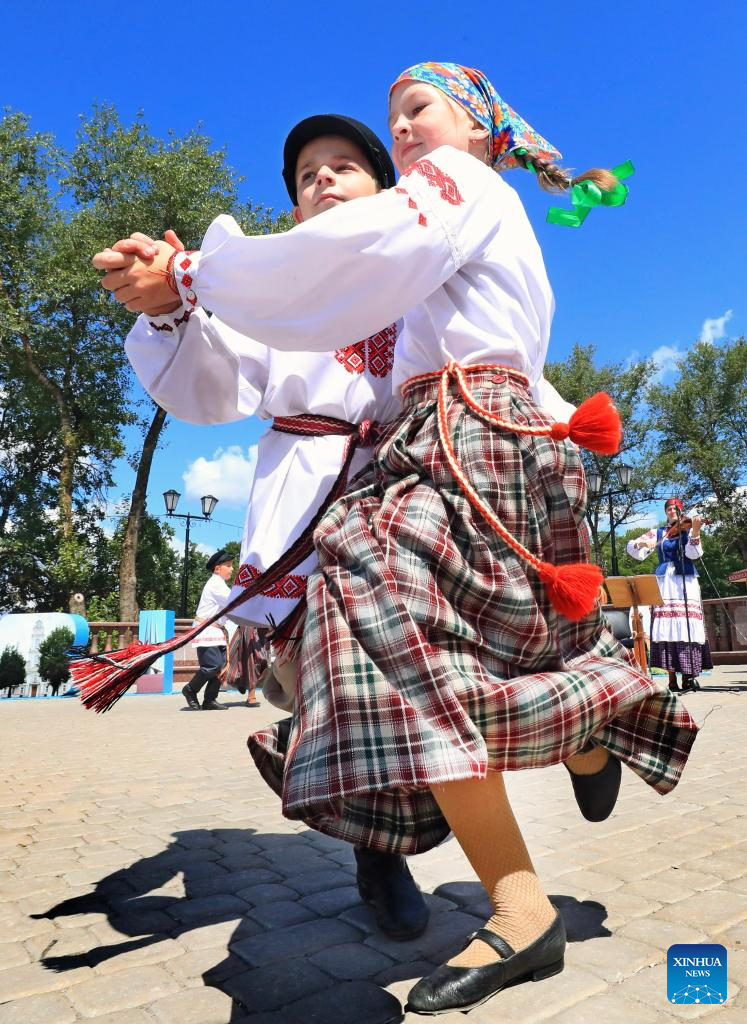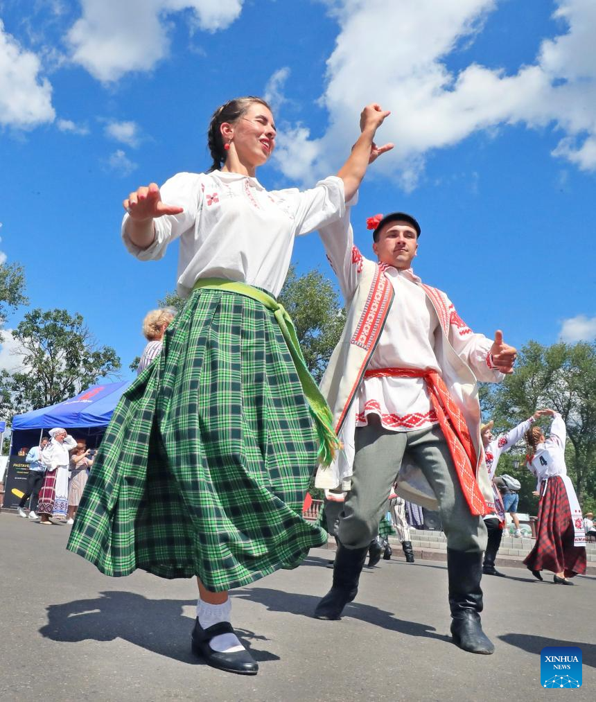 People dance during a folk dance competition in Vitebsk, Belarus, July 15, 2023. A folk dance competition was held here during the 32nd International Festival of Arts "Slavianski Bazaar". (Photo by Henadz Zhinkov/Xinhua)