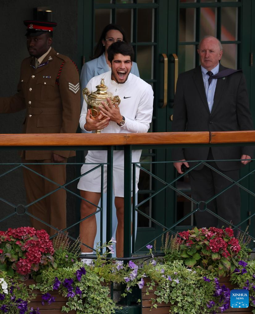 Carlos Alcaraz celebrates at the club balcony after winning the men's singles final match between Novak Djokovic of Serbia and Carlos Alcaraz of Spain at Wimbledon Tennis Championships in London, Britain, July 16, 2023. (Xinhua/Han Yan)