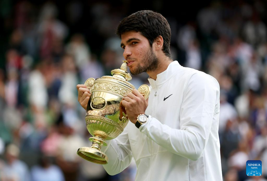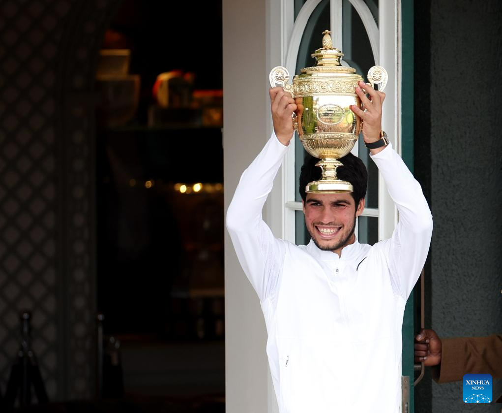 LONDON, July 16 (Xinhua) -- World No. 1 Carlos Alcaraz of Spain thwarted Novak Djokovic's quest for a record-leveling 24th Grand Slam title at Wimbledon on Sunday. Overcoming an early setback, the 20-year-old defeated second-seeded Djokovic 1-6, 7-6 (6), 6-1, 3-6, 6-4 to clinch his second Grand Slam trophy.