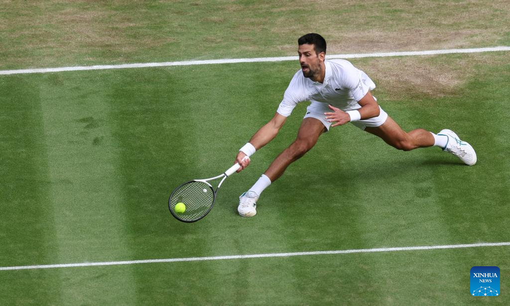 Novak Djokovic competes during the men's singles final match between Novak Djokovic of Serbia and Carlos Alcaraz of Spain at Wimbledon Tennis Championships in London, Britain, July 16, 2023. (Xinhua/Han Yan)
