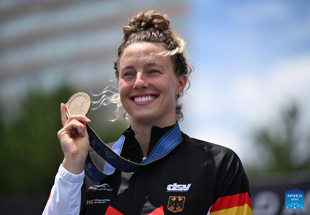 Leonie Beck of Germany poses for the awarding ceremony after the open water women 5km of World Aquatics Championships 2023 held in Fukuoka, Japan, July 18, 2023. (Xinhua/Xia Yifang)