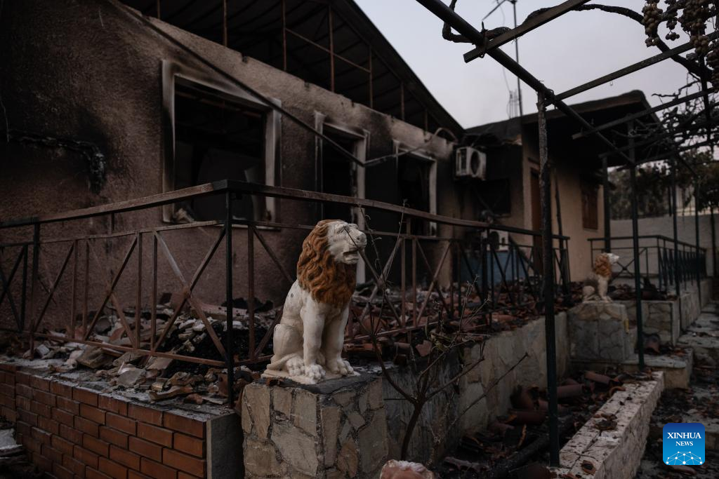 This photo taken on July 17, 2023 shows a house damaged by wildfires near Loutraki, Greece. Greek firefighters were battling wildfires on Monday near Kouvaras, a settlement some 30 km southeast of Athens, as well as in the vicinity of the seaside resort of Loutraki, about 80 km southwest of the capital, and at two other locations. (Photo by Lefteris Partsalis/Xinhua)