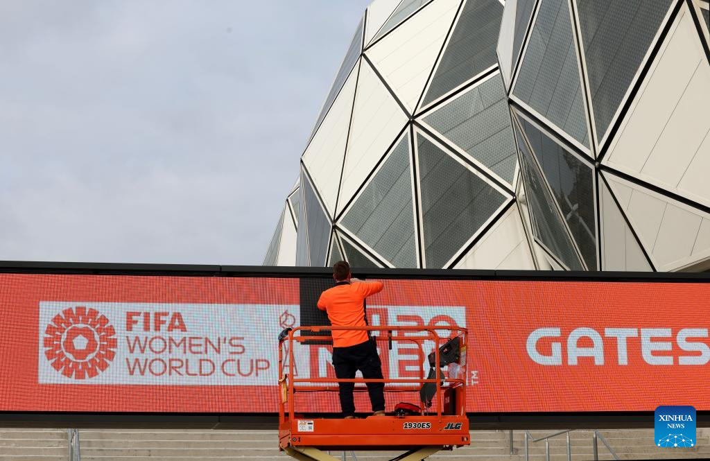(230719) -- MELBOURNE, July 19, 2023 (Xinhua) -- A worker works on a digital screen of the 2023 FIFA Women's World Cup outside the Melbourne Rectangular Stadium in Melbourne, Australia, July 19, 2023. The opening match of the 2023 FIFA Women's World Cup will be held at Auckland's Eden Park on Thursday. The game marks the beginning of the month-long tournament co-hosted by New Zealand and Australia. (Xinhua/Zhang Chen)