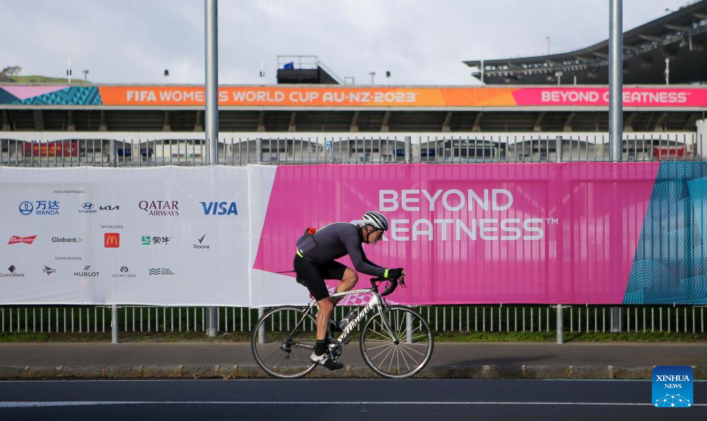 (230719) -- AUCKLAND, July 19, 2023 (Xinhua) -- A biker passes Eden Park in Auckland, New Zealand on July 17, 2023. The opening match of the 2023 FIFA Women's World Cup will be held at Auckland's Eden Park on Thursday. The game marks the beginning of the month-long tournament co-hosted by New Zealand and Australia. (Photo by Zhao Gang/Xinhua)