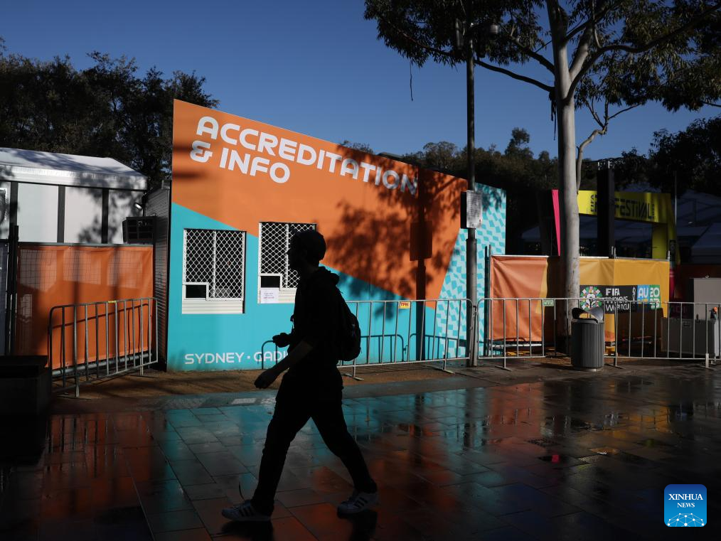 A man walks past a Fan Park of the 2023 FIFA Women's World Cup in Sydney, Australia on July 17, 2023. The opening match of the 2023 FIFA Women's World Cup will be held at Auckland's Eden Park on Thursday. The game marks the beginning of the month-long tournament co-hosted by New Zealand and Australia. (Xinhua/Qin Lang)