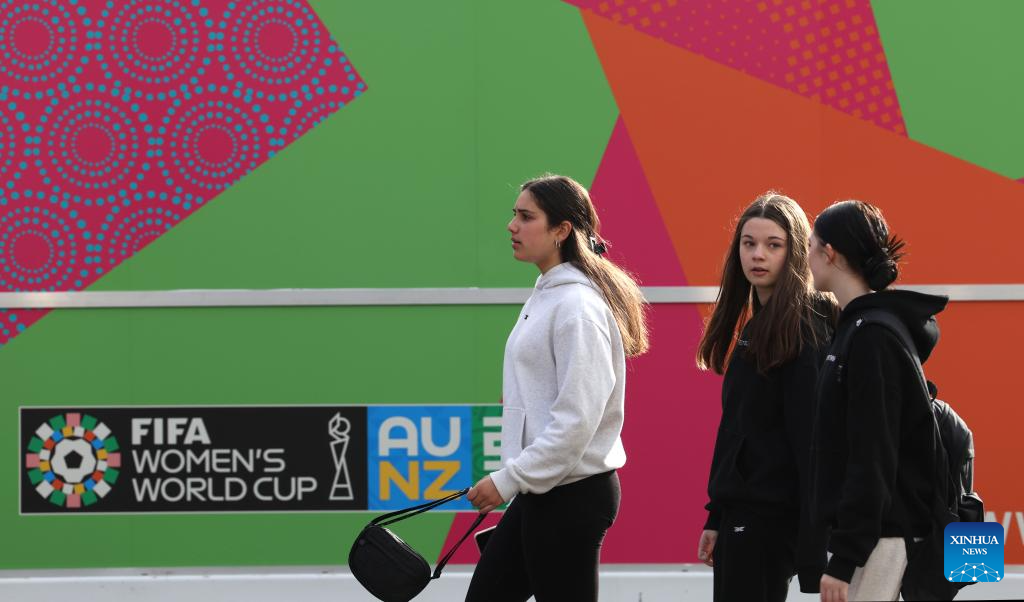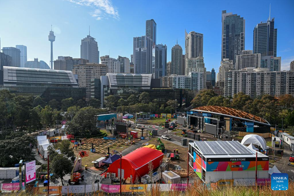 Workers are seen in a Fan Park of the 2023 FIFA Women's World Cup in Sydney, Australia on July 17, 2023. The opening match of the 2023 FIFA Women's World Cup will be held at Auckland's Eden Park on Thursday. The game marks the beginning of the month-long tournament co-hosted by New Zealand and Australia. (Xinhua/Mao Siqian)