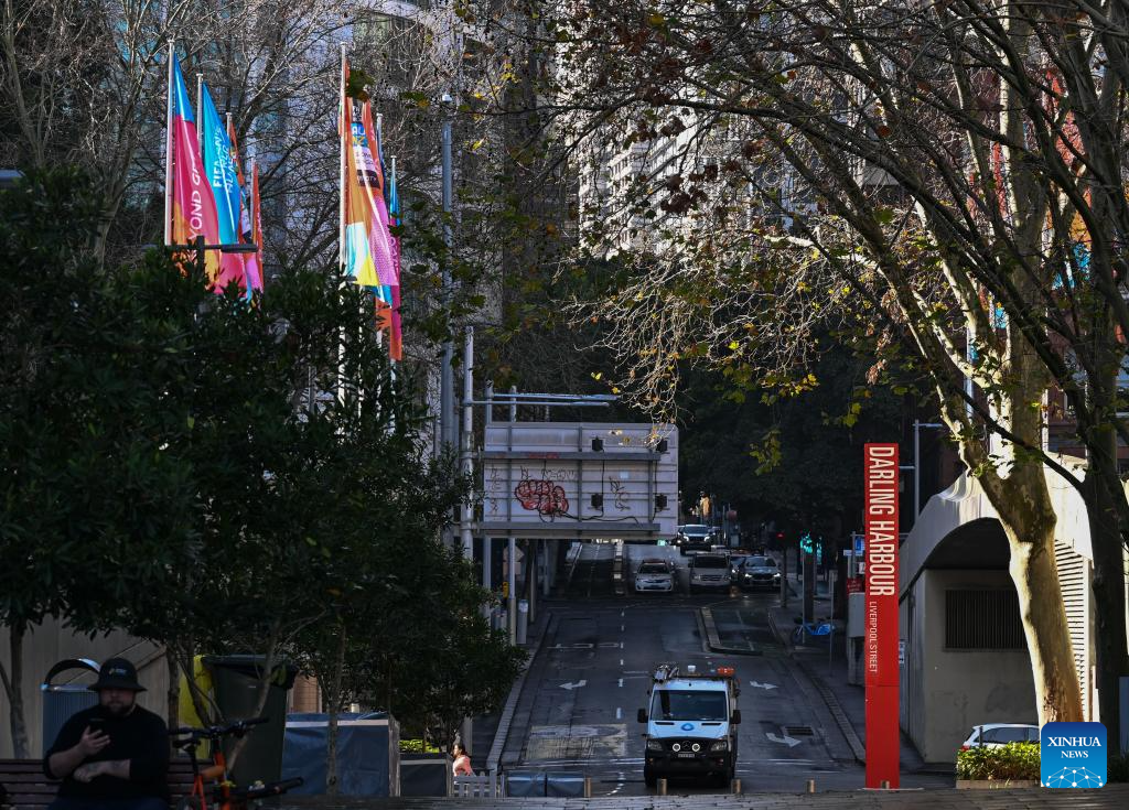 A car drives along a road which is decorated with flags of the 2023 FIFA Women's World Cup in Sydney, Australia, July 17, 2023. The opening match of the 2023 FIFA Women's World Cup will be held at Auckland's Eden Park on Thursday. The game marks the beginning of the month-long tournament co-hosted by New Zealand and Australia. (Xinhua/Mao Siqian)