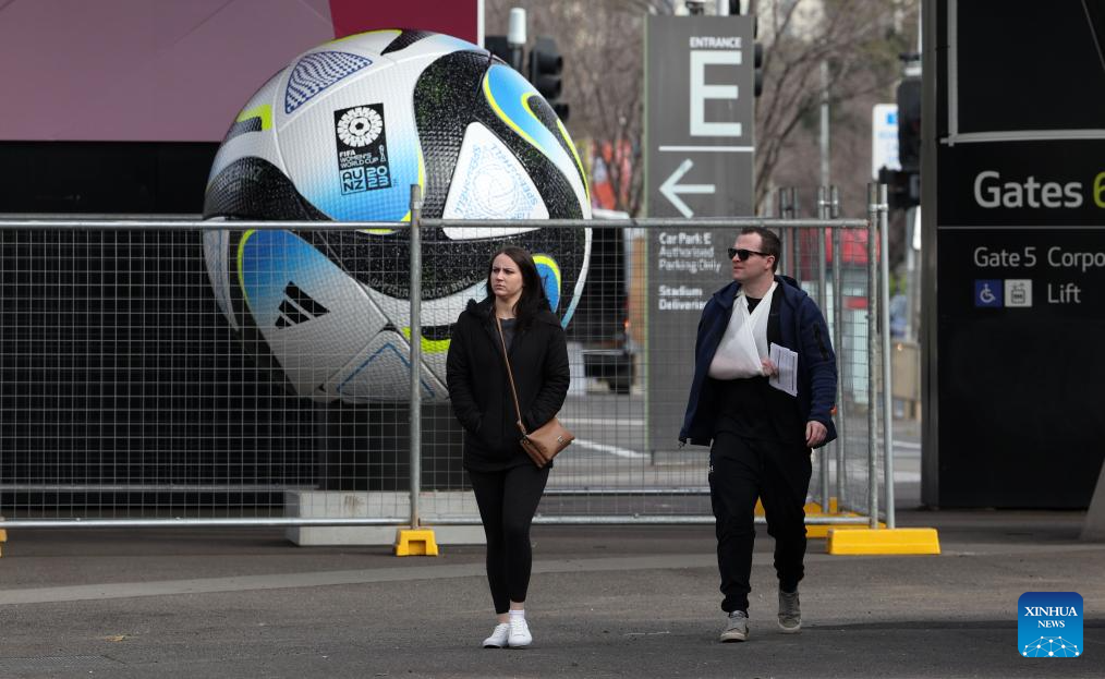 (230719) -- MELBOURNE, July 19, 2023 (Xinhua) -- People walk past a giant official ball of the 2023 FIFA Women's World Cup outside the Melbourne Rectangular Stadium in Melbourne, Australia, July 19, 2023. The opening match of the 2023 FIFA Women's World Cup will be held at Auckland's Eden Park on Thursday. The game marks the beginning of the month-long tournament co-hosted by New Zealand and Australia. (Xinhua/Zhang Chen)