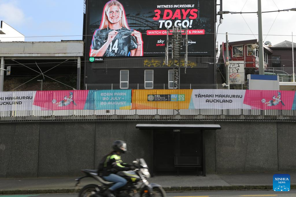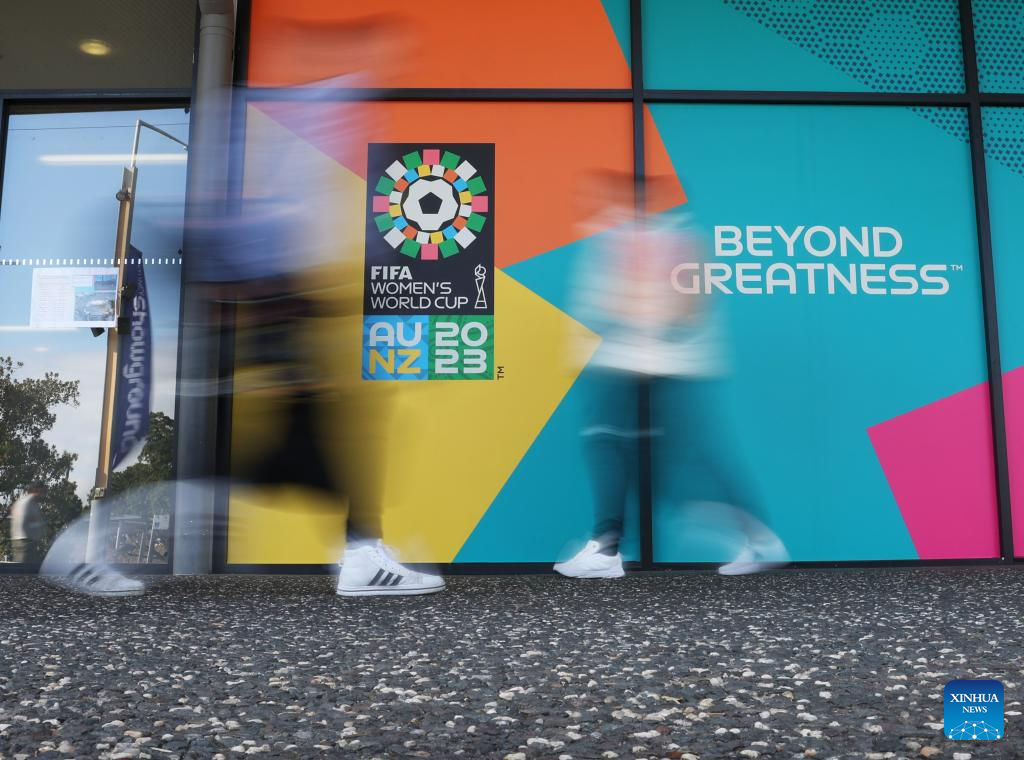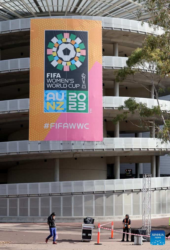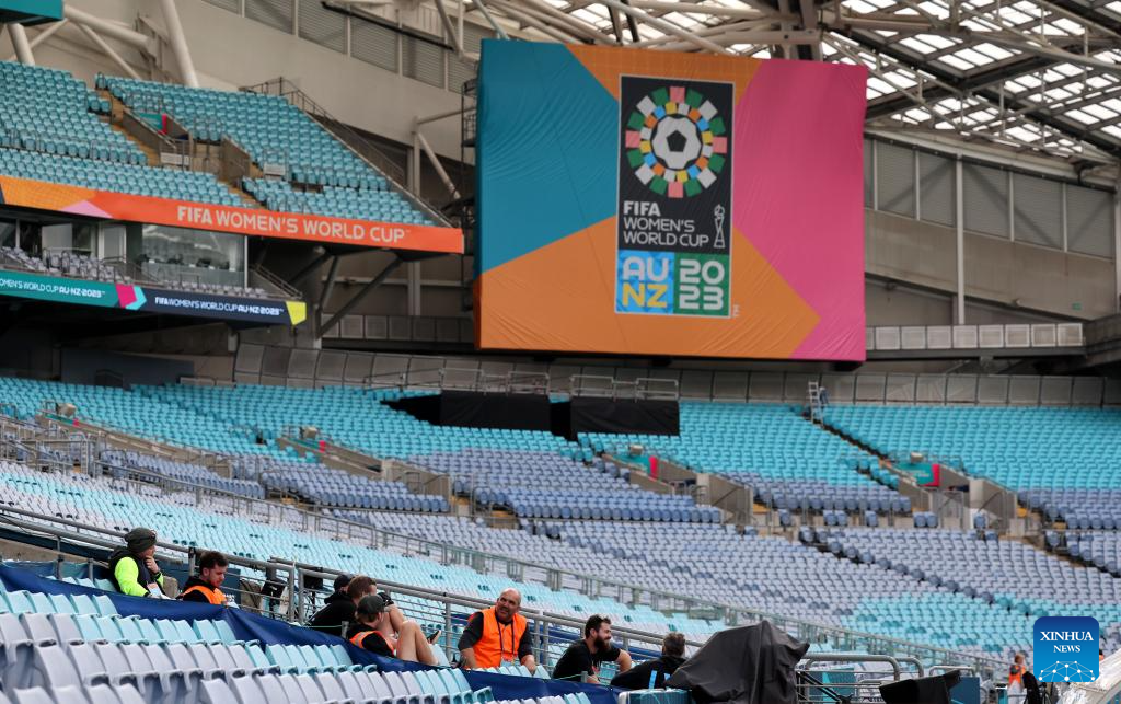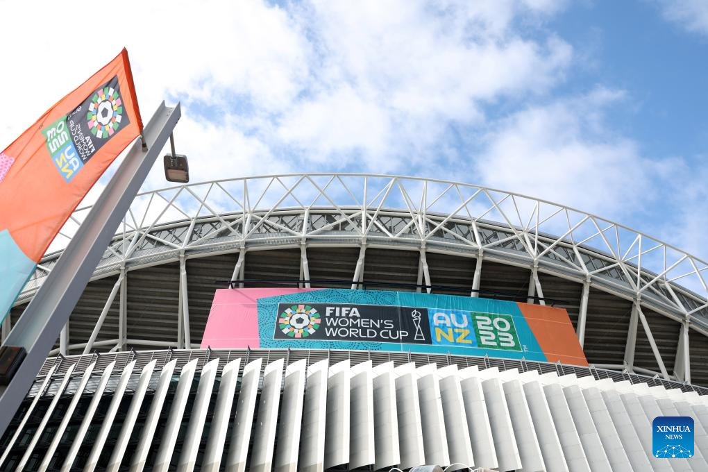 Photo taken on July 17, 2023 shows the giant poster of the 2023 FIFA Women's World Cup outside the Stadium Australia in Sydney, Australia. The opening match of the 2023 FIFA Women's World Cup will be held at Auckland's Eden Park on Thursday. The game marks the beginning of the month-long tournament co-hosted by New Zealand and Australia. (Xinhua/Zhang Chen)