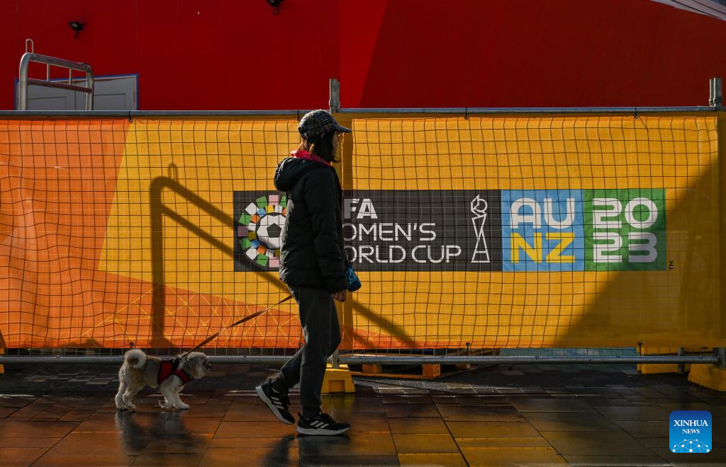 A person walks a dog passing a Fan Park of the 2023 FIFA Women's World Cup in Sydney, Australia, July 17, 2023. The opening match of the 2023 FIFA Women's World Cup will be held at Auckland's Eden Park on Thursday. The game marks the beginning of the month-long tournament co-hosted by New Zealand and Australia. (Xinhua/Mao Siqian)