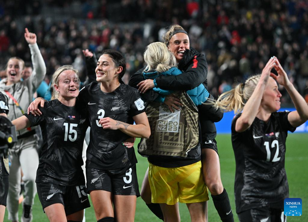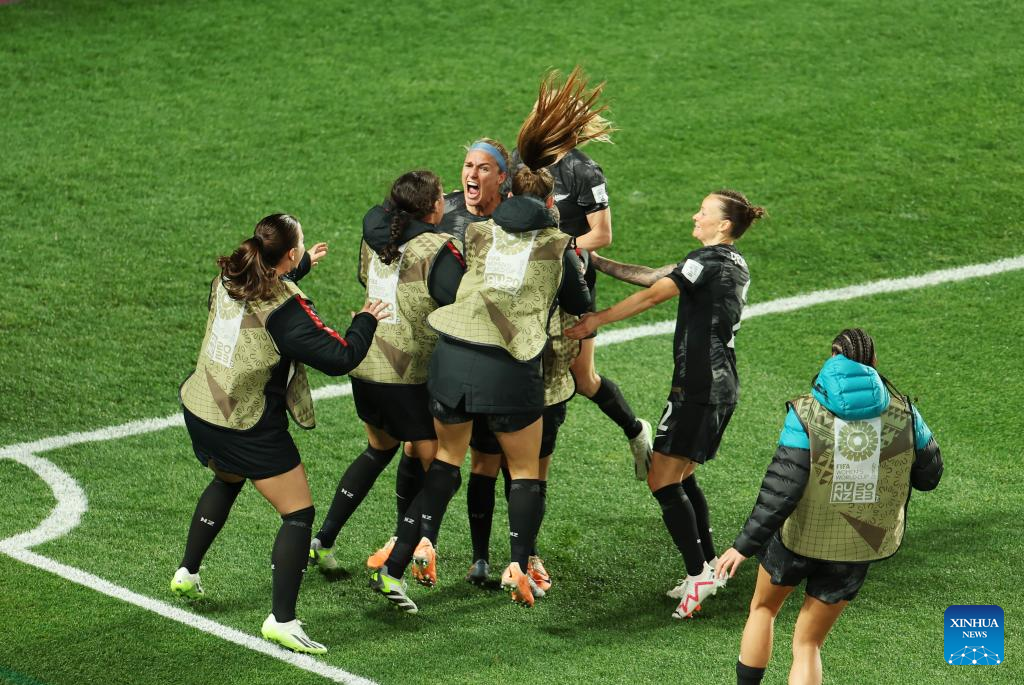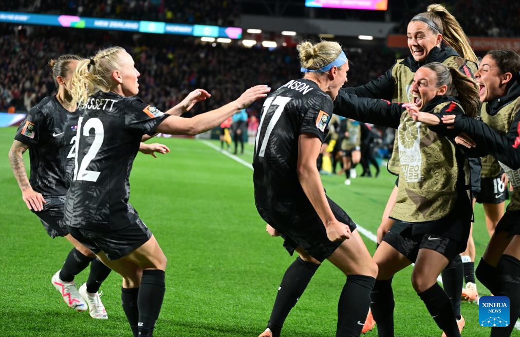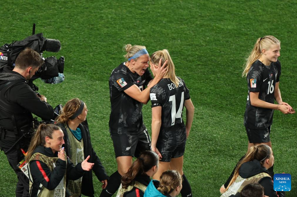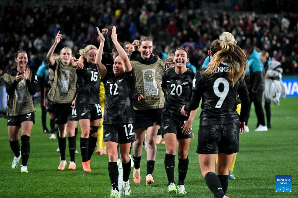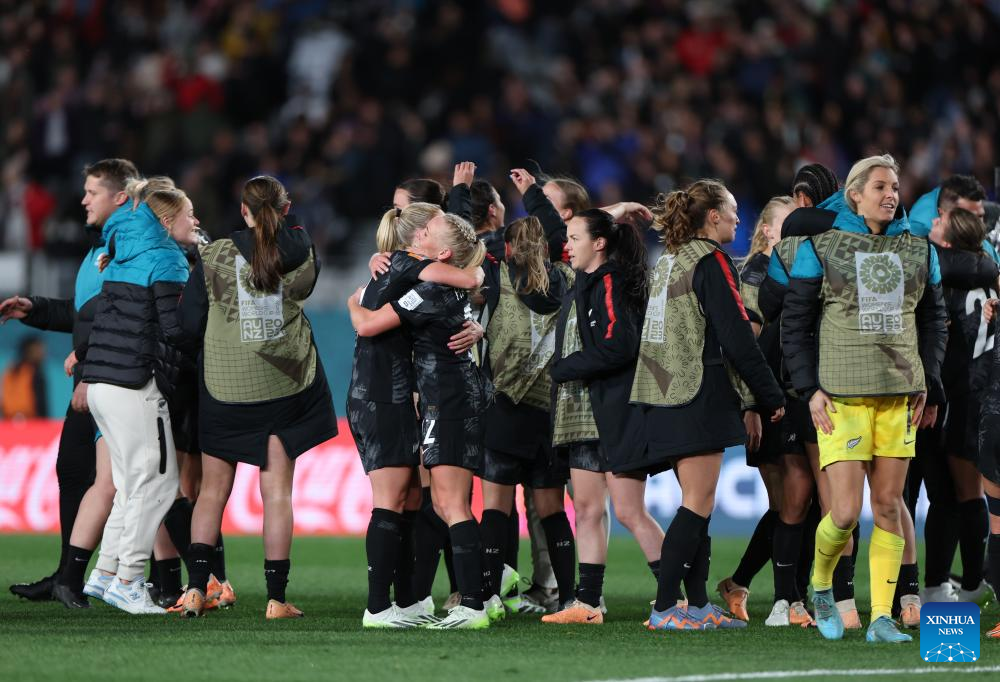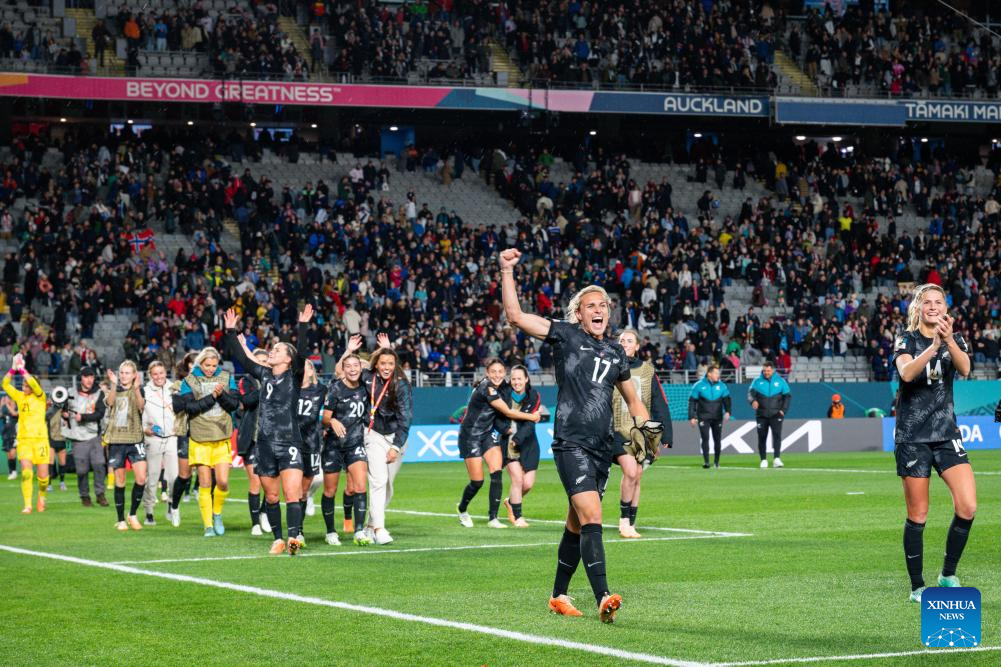 Players of New Zealand celebrate after the group A match between New Zealand and Norway at the FIFA Women's World Cup Australia & New Zealand 2023 in Auckland, New Zealand, July 20, 2023. (Xinhua/Zhu Wei)