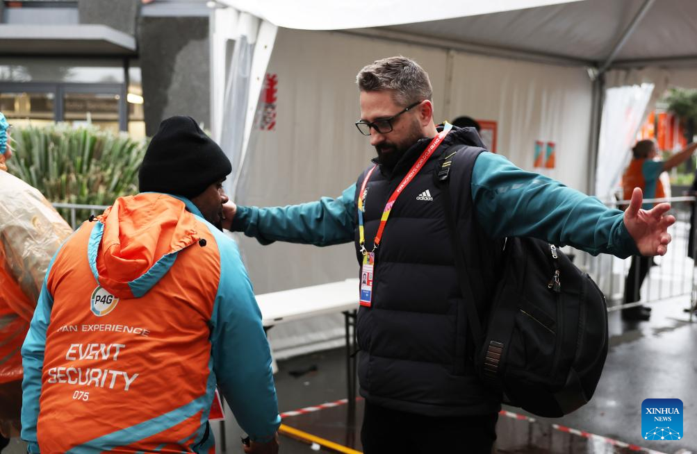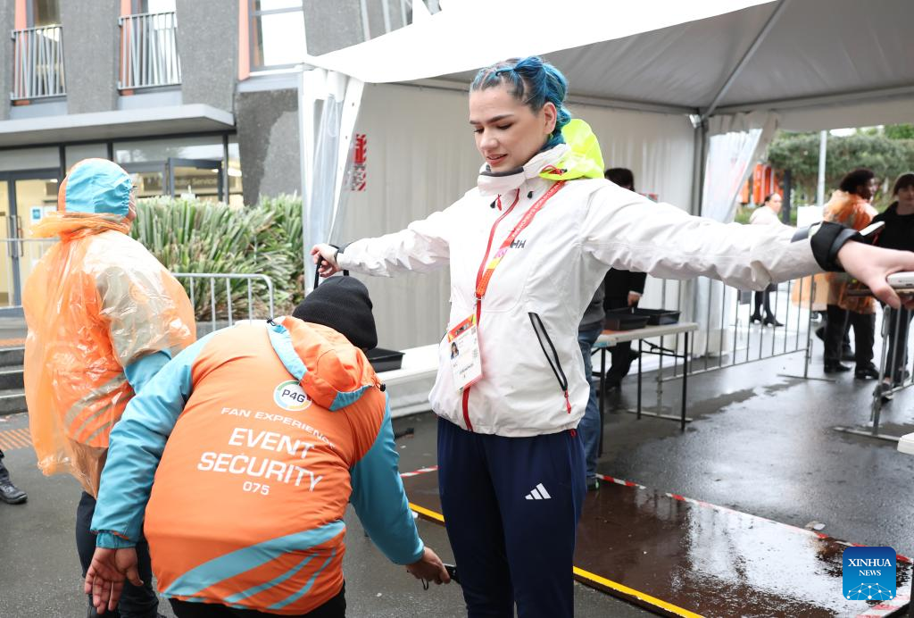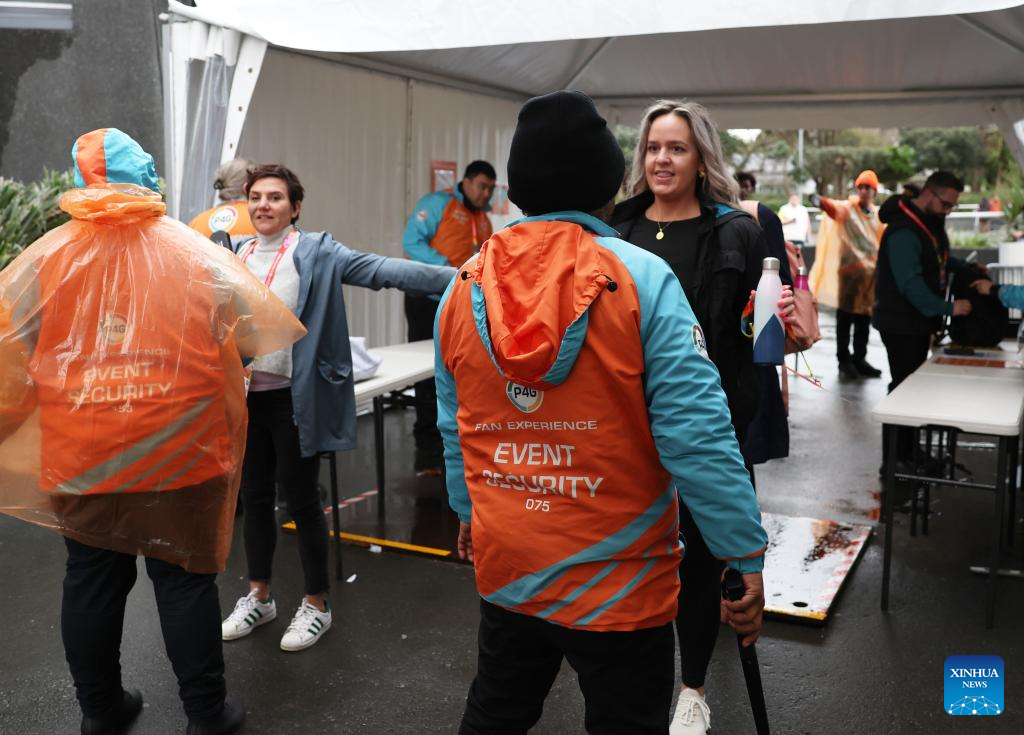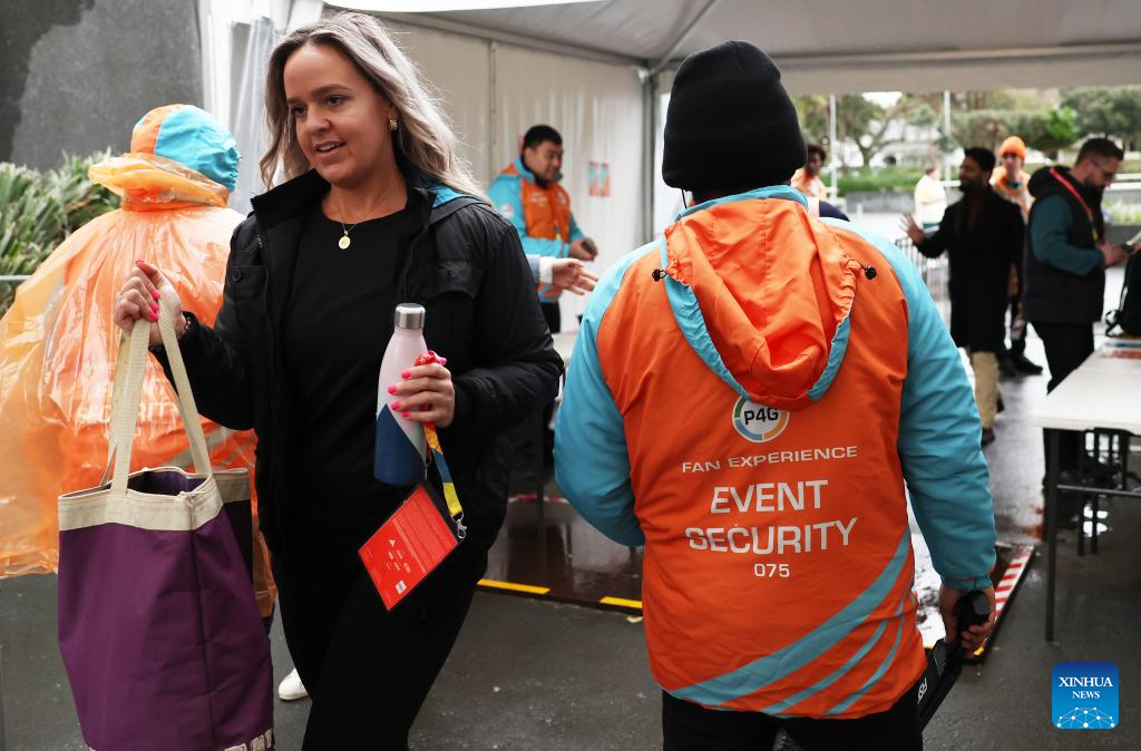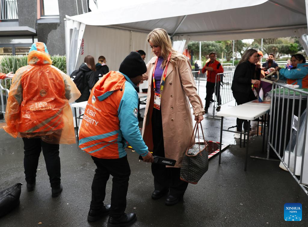Security personel conduct security check at the entrance before the opening match of the 2023 FIFA Women's World Cup between New Zealand and Norway in Auckland, New Zealand on July 20, 2023. (Xinhua/Qin Lang)