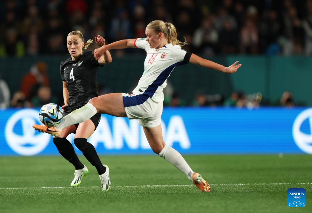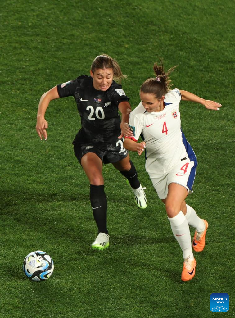 Ria Percival (C) of New Zealand vies with Guro Reiten of Norway during the group A match between New Zealand and Norway at the FIFA Women's World Cup Australia & New Zealand 2023 in Auckland, New Zealand, July 20, 2023. (Xinhua/Zhu Wei)