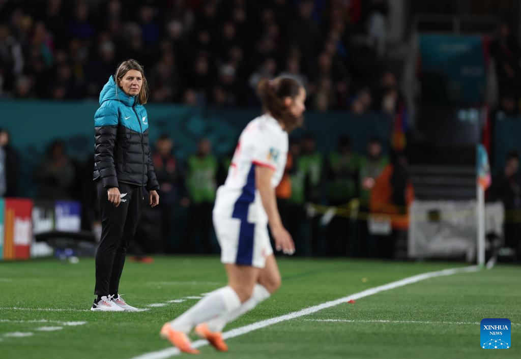 Jitka Klimkova (1st L), head coach of New Zealand, reacts after the group A match between New Zealand and Norway at the FIFA Women's World Cup Australia & New Zealand 2023 in Auckland, New Zealand, July 20, 2023. (Xinhua/Qin Lang)