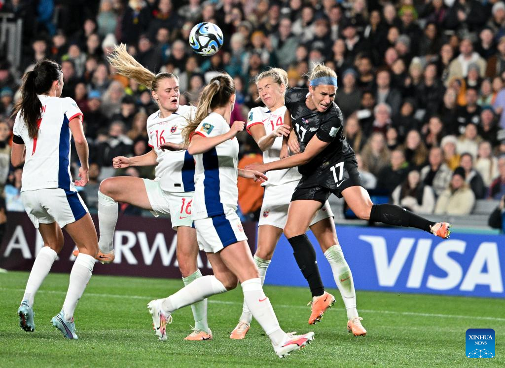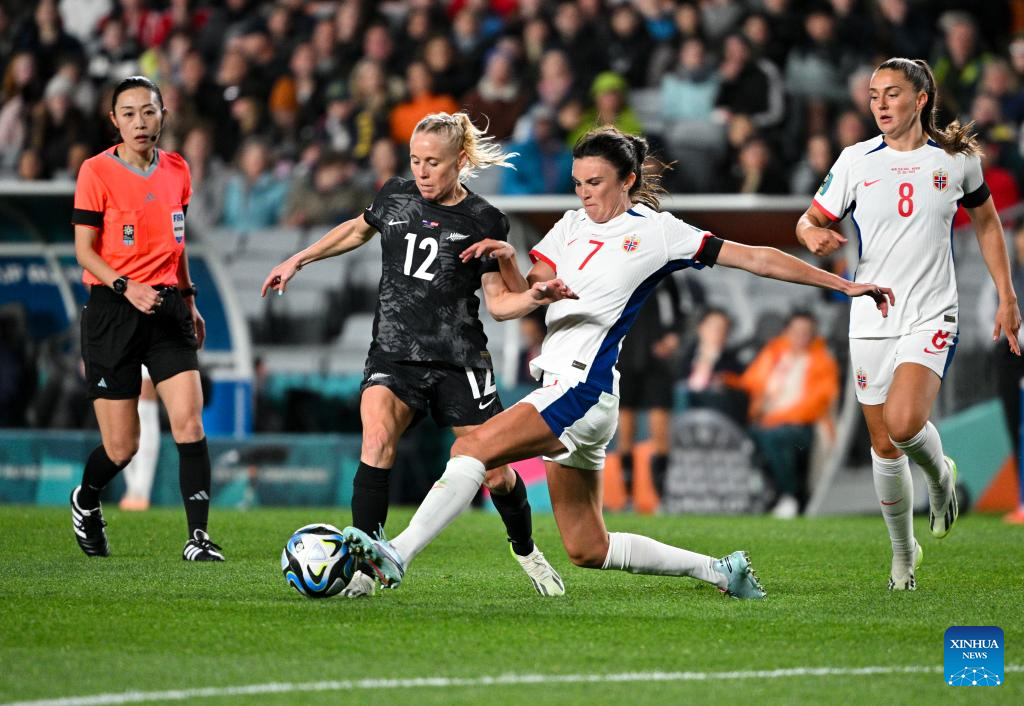 Hannah Wilkinson (3rd L) of New Zealand vies the ball during the group A match between New Zealand and Norway at the FIFA Women's World Cup Australia & New Zealand 2023 in Auckland, New Zealand, July 20, 2023. (Xinhua/Bai Xuefei)