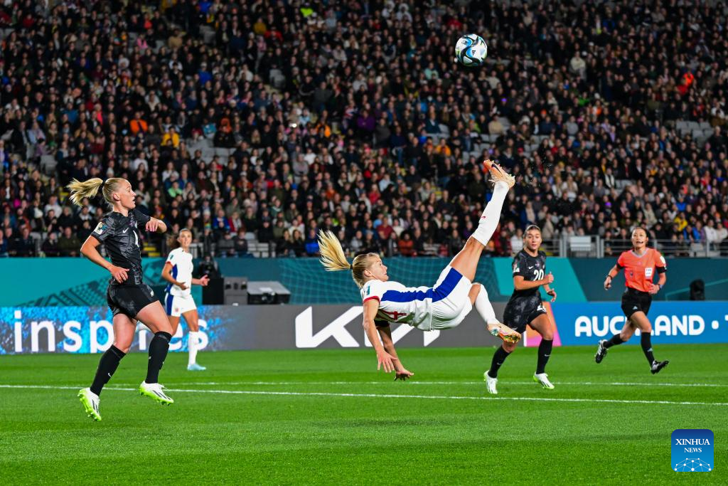 Ada Hegerberg (R) of Norway shoots during the group A match between New Zealand and Norway at the FIFA Women's World Cup Australia & New Zealand 2023 in Auckland, New Zealand, July 20, 2023. (Xinhua/Zhu Wei)