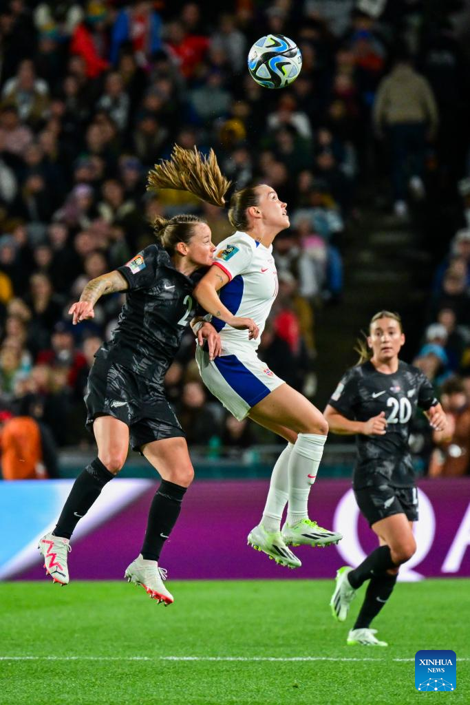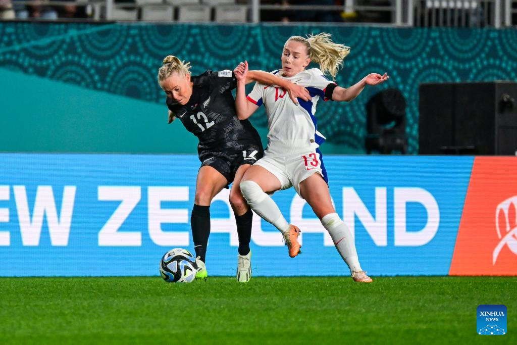Katie Bowen (Front) of New Zealand vies the ball during the group A match between New Zealand and Norway at the FIFA Women's World Cup Australia & New Zealand 2023 in Auckland, New Zealand, July 20, 2023. (Xinhua/Qin Lang)