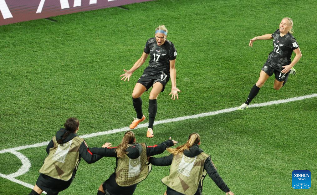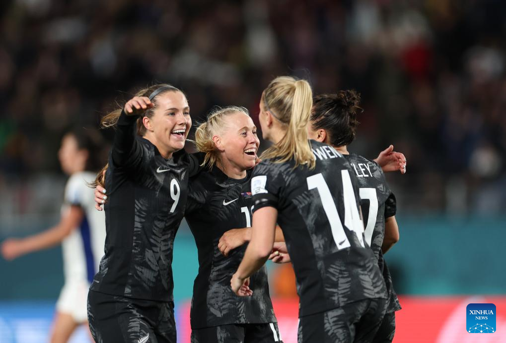 Hannah Wilkinson (C) of New Zealand celebrates with teammates during the group A match between New Zealand and Norway at the FIFA Women's World Cup Australia & New Zealand 2023 in Auckland, New Zealand, July 20, 2023. (Xinhua/Zhu Wei)