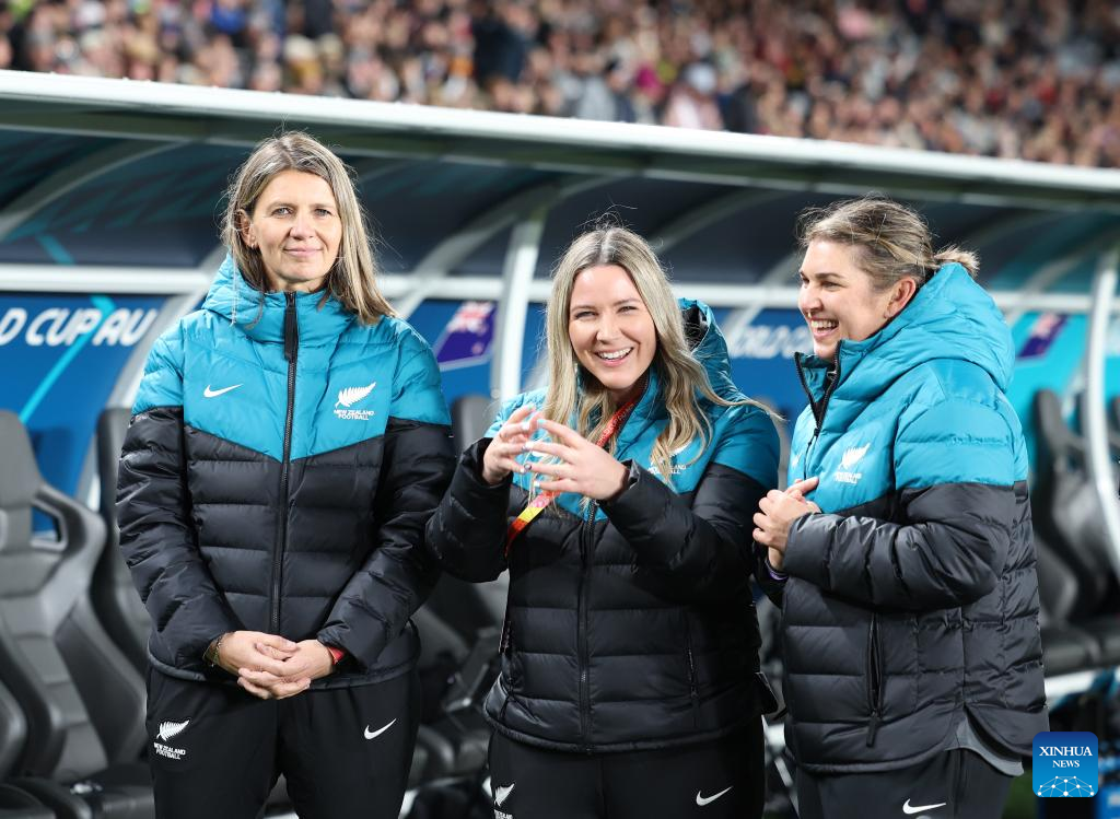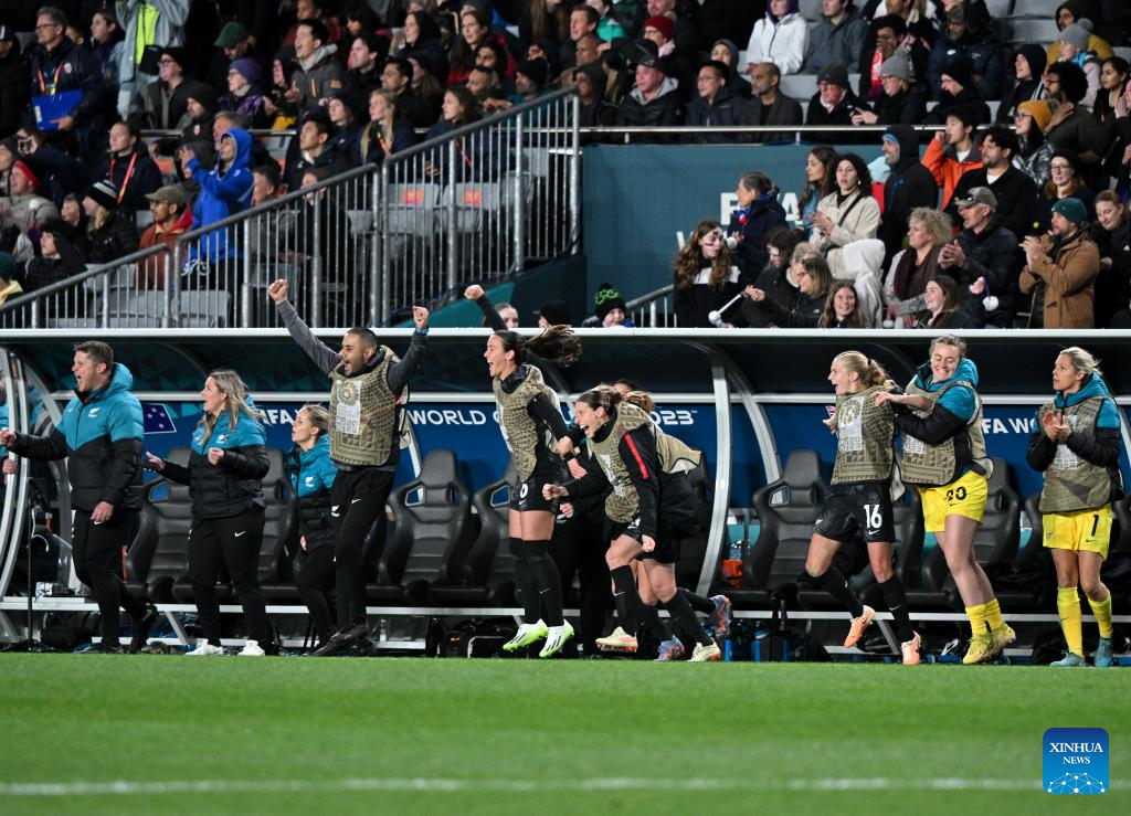 Substitution players of of New Zealand celebrate after the group A match between New Zealand and Norway at the FIFA Women's World Cup Australia & New Zealand 2023 in Auckland, New Zealand, July 20, 2023. (Xinhua/Guo Lei)