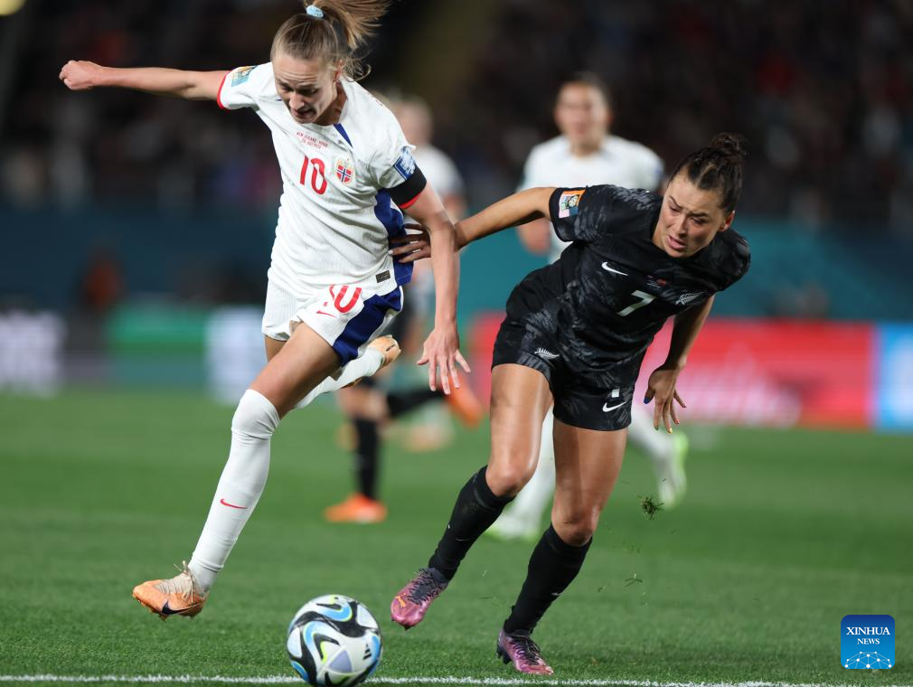 Ria Percival (L) of New Zealand vies with Guro Reiten of Norway during the group A match between New Zealand and Norway at the FIFA Women's World Cup Australia & New Zealand 2023 in Auckland, New Zealand, July 20, 2023. (Xinhua/Zhu Wei)