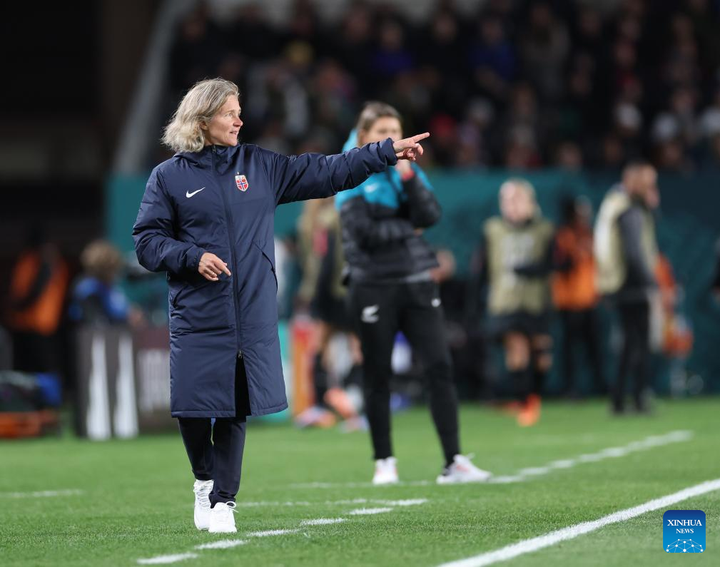 Hege Riise, head coach of Norway, reacts during the group A match between New Zealand and Norway at the FIFA Women's World Cup Australia & New Zealand 2023 in Auckland, New Zealand, July 20, 2023. (Xinhua/Qin Lang)