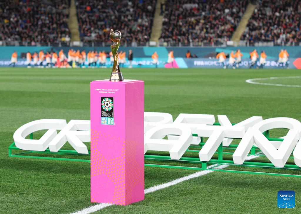 The FIFA Women's World Cup Trophy is exhibited prior to the group A match between New Zealand and Norway at the FIFA Women's World Cup Australia & New Zealand 2023 in Auckland, New Zealand, July 20, 2023. (Xinhua/Qin Lang)