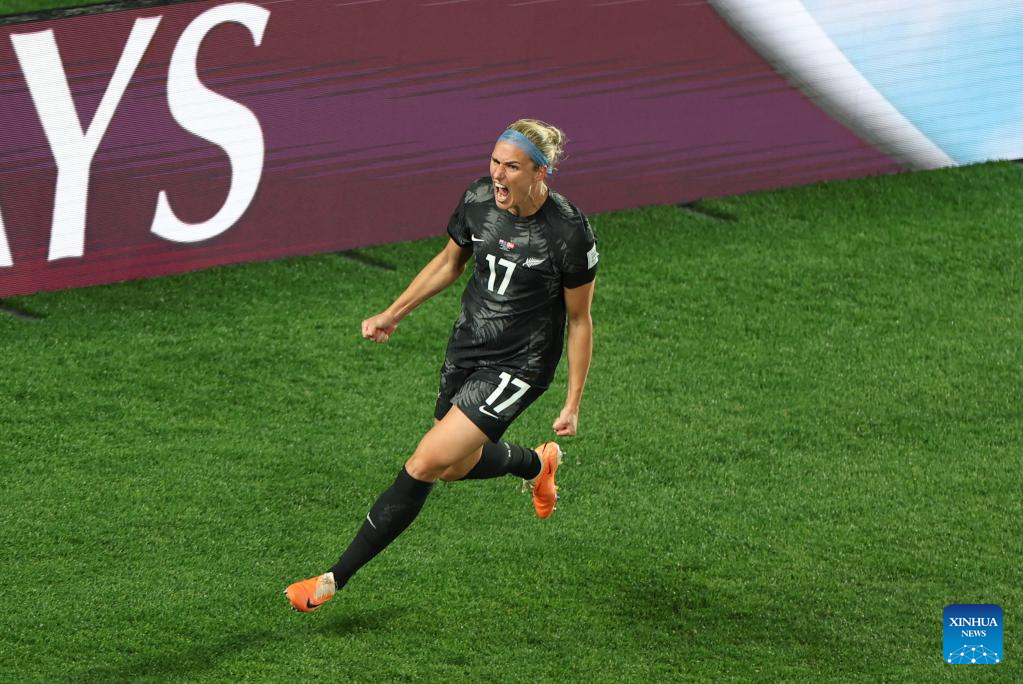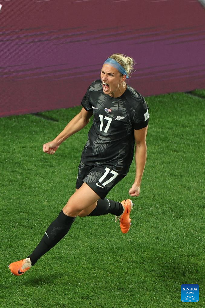 Hannah Wilkinson of New Zealand celebrates scoring during the group A match between New Zealand and Norway at the FIFA Women's World Cup Australia & New Zealand 2023 in Auckland, New Zealand, July 20, 2023. (Xinhua/Bai Xuefei)