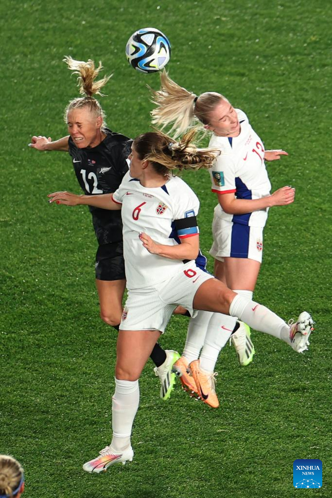 Maren Mjelde (C) and Thea Bjelde of Norway vie with Betsy Hassett of New Zealand for a header during the group A match between New Zealand and Norway at the FIFA Women's World Cup Australia & New Zealand 2023 in Auckland, New Zealand, July 20, 2023. (Xinhua/Bai Xuefei)