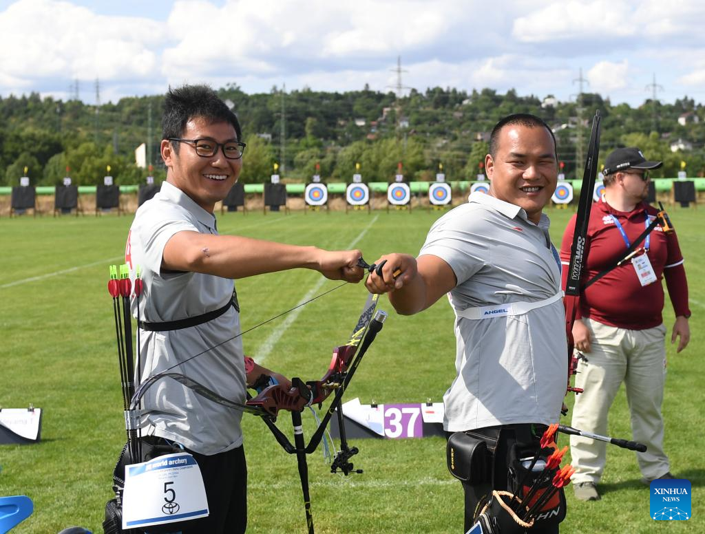 Chinese archer Gan Jun (L) and Yu He pose for a photo during the fourth round of the individual elimination matches of Recurve Men Open at 2023 World Archery Para Championships in Pilsen, the Czech Republic, July 20, 2023. (Xinhua/He Canling)