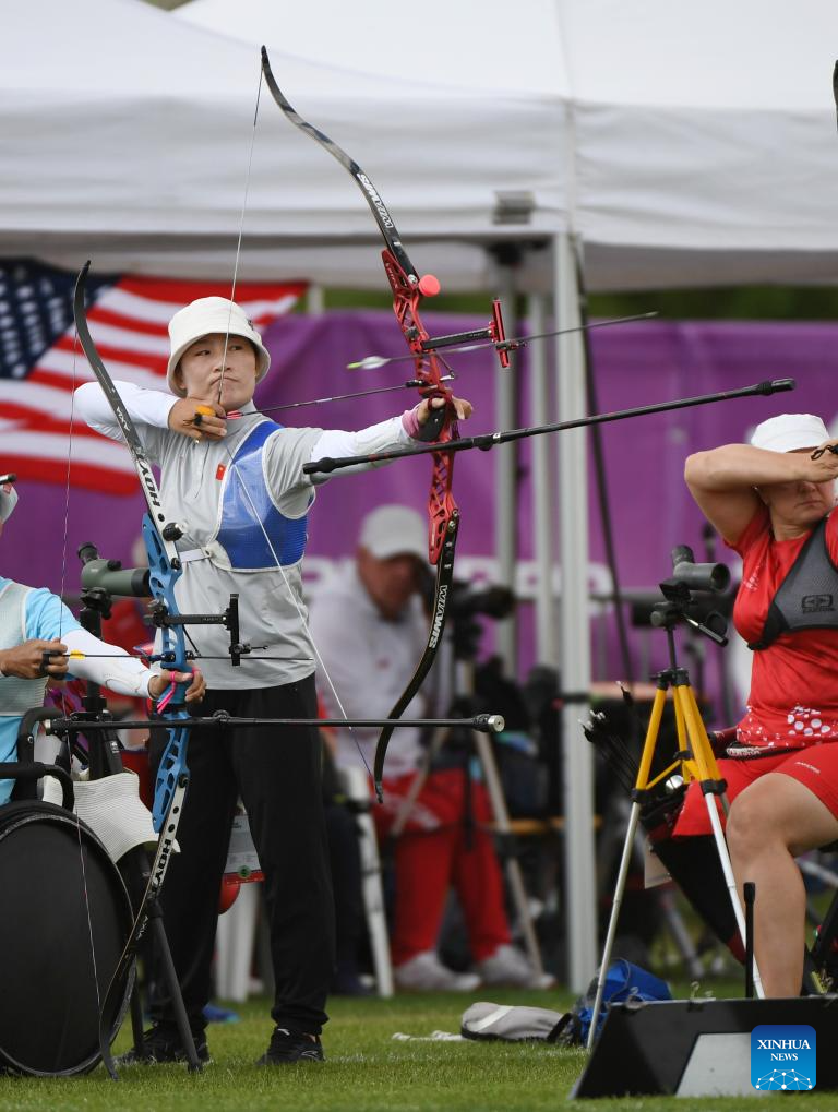 Chinese archer Wu Yang competes during the third round of the individual elimination matches of Recurve Women Open at 2023 World Archery Para Championships in Pilsen, the Czech Republic, July 20, 2023. (Xinhua/He Canling)