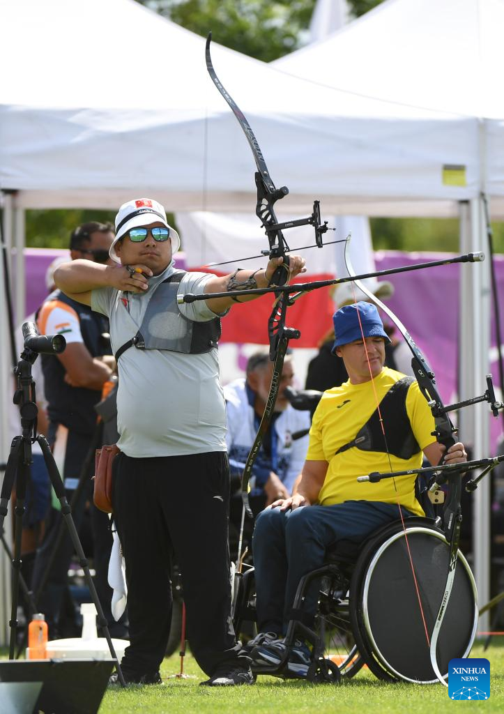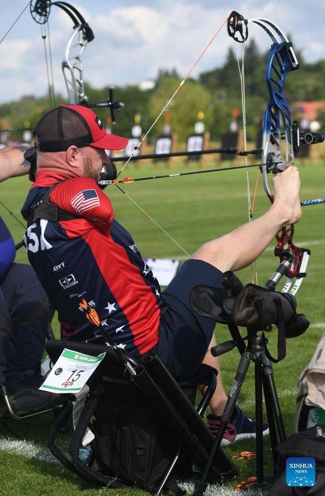 Chinese archer Zhao Lixue competes during the third round of the individual elimination matches of Recurve Men Open at 2023 World Archery Para Championships in Pilsen, the Czech Republic, July 20, 2023. (Xinhua/He Canling)