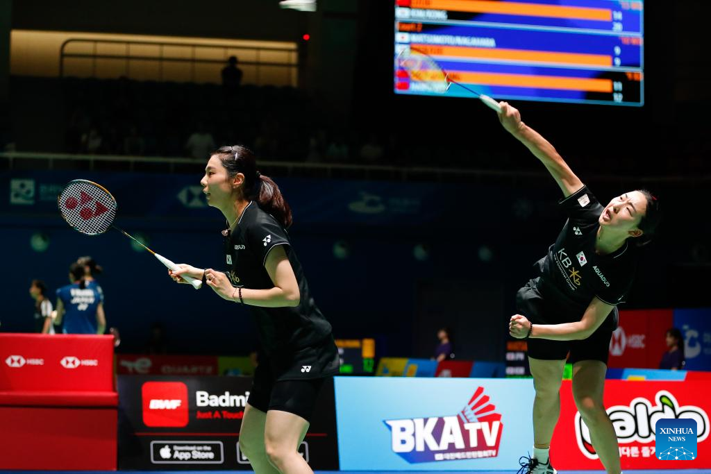 Iwanaga Rin/Nakanish Kie (front) of Japan compete during the women's doubles quarter finals against Chen Qingchen/Jia Yifan of China at the BWF Korea Open Badminton Championships 2023 in Yeosu, South Korea, July 21, 2023. (Xinhua/Wang Yiliang)