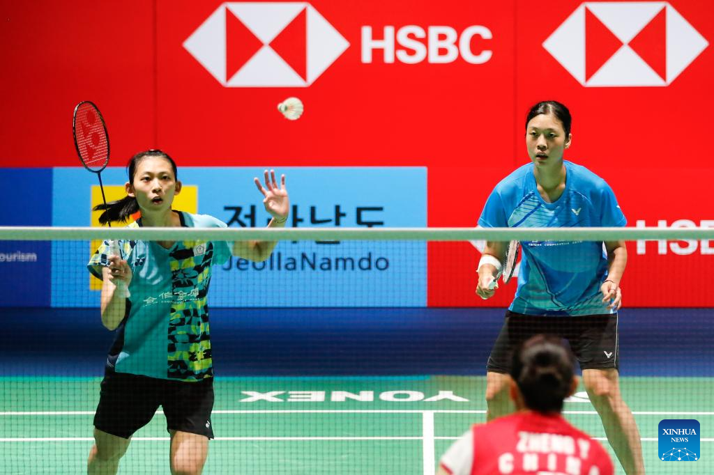 Hu Lingfang(L)/Lin Xiaomin of Chinese Taipei compete during the women's doubles quarter finals against Zhang Shuxian/Zheng Yu of China at the BWF Korea Open Badminton Championships 2023 in Yeosu, South Korea, July 21, 2023. (Xinhua/Wang Yiliang)