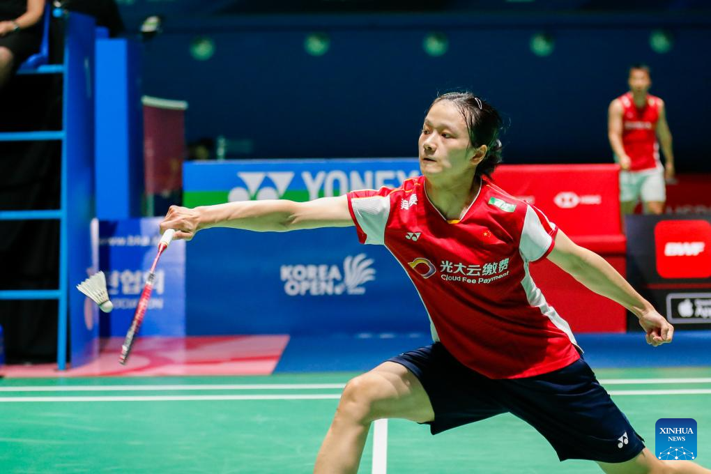 Zhang Yiman of China competes during the women's singles quarter finals against Tai Tzuying of Chinese Taipei at the BWF Korea Open Badminton Championships 2023 in Yeosu, South Korea, July 21, 2023. (Xinhua/Wang Yiliang)