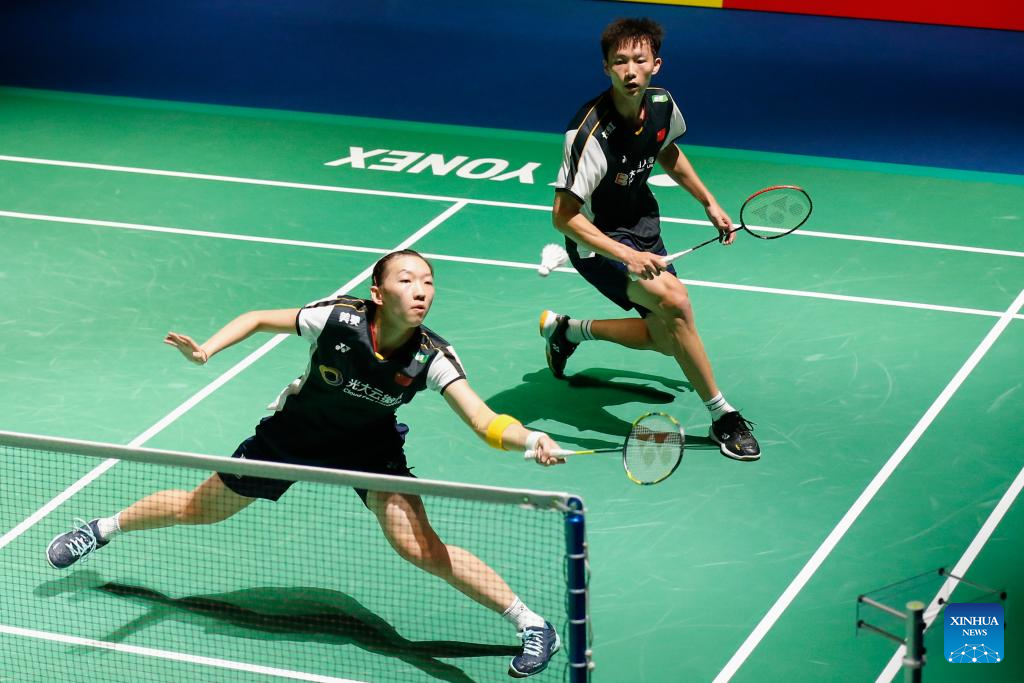 Zheng Siwei/Huang Yaqiong(front) of China compete during the mixed doubles quarter finals against Jiang Zhenbang/Wei Yaxin of China at the BWF Korea Open Badminton Championships 2023 in Yeosu, South Korea, July 21, 2023. (Xinhua/Wang Yiliang)