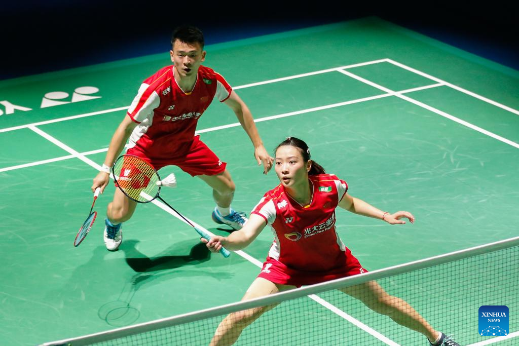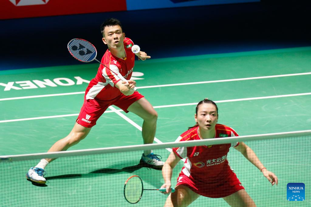 Zheng Siwei(L)/Huang Yaqiong of China compete during the mixed doubles quarter finals against Jiang Zhenbang/Wei Yaxin of China at the BWF Korea Open Badminton Championships 2023 in Yeosu, South Korea, July 21, 2023. (Xinhua/Wang Yiliang)