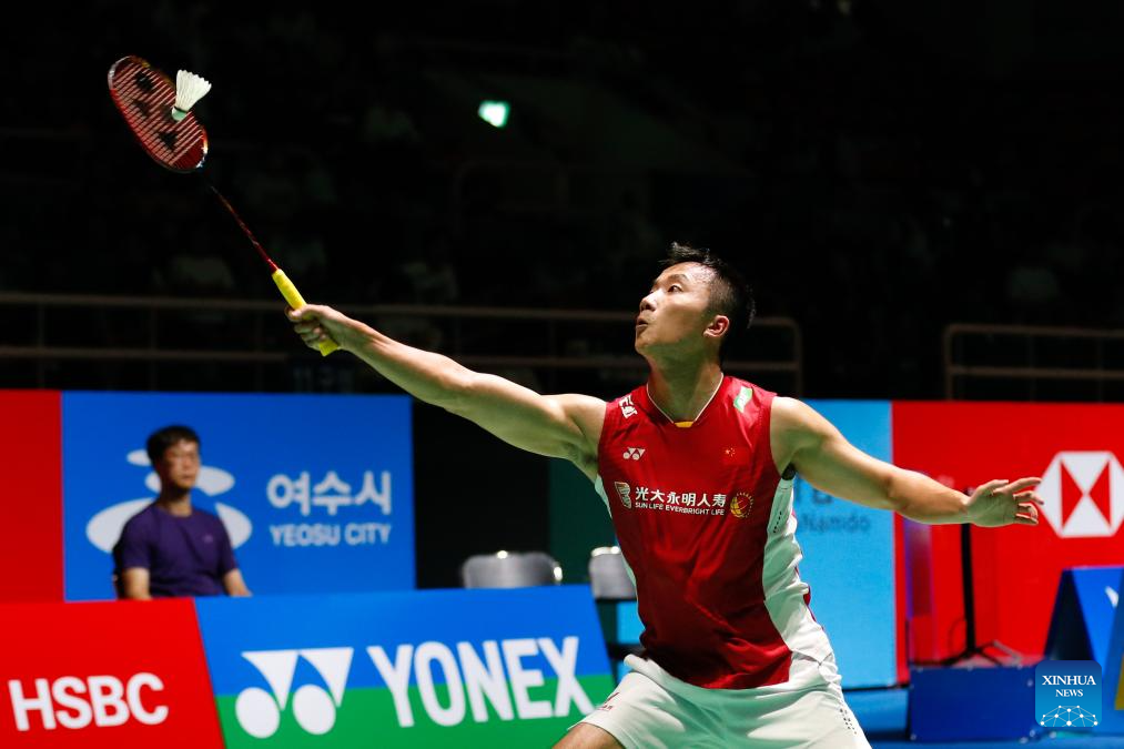 Lu Guangzu of China competes during the men's singles quarter finals against Shi Yuqi of China at the BWF Korea Open Badminton Championships 2023 in Yeosu, South Korea, July 21, 2023. (Xinhua/Wang Yiliang)
