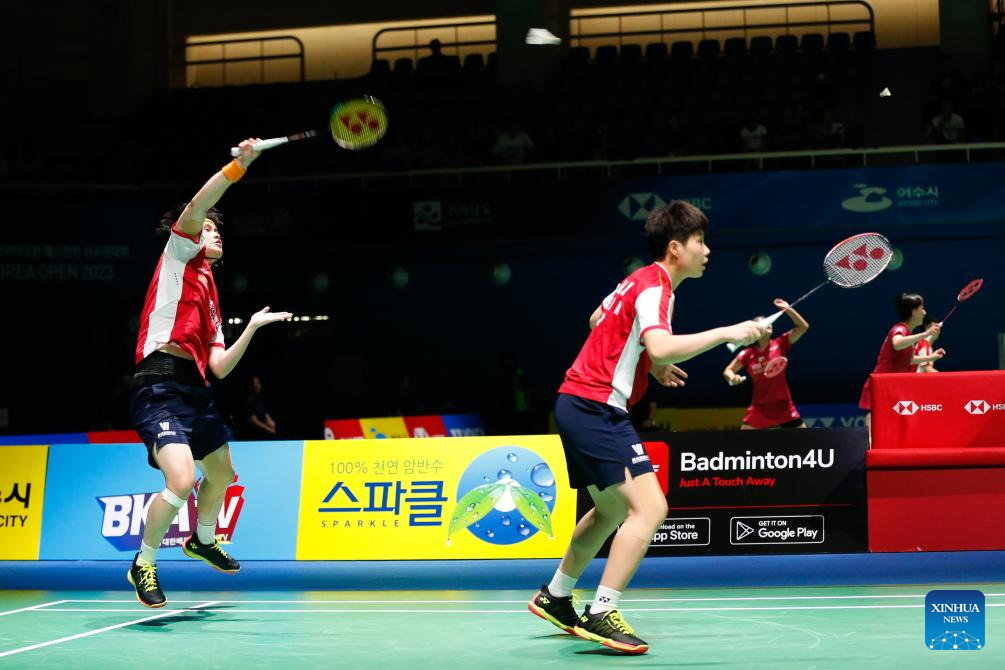 Liang Weikeng(L)/Wang Chang of China compete during the men's doubles quarter finals against Kim Younghyuk/Wang Chan of South Korea at the BWF Korea Open Badminton Championships 2023 in Yeosu, South Korea, July 21, 2023. (Xinhua/Wang Yiliang)