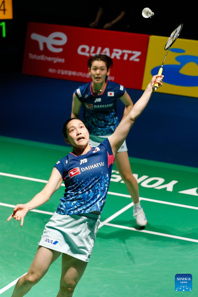 Iwanaga Rin(L)/Nakanish Kie of Japan compete during the women's doubles quarter finals against Chen Qingchen/Jia Yifan of China at the BWF Korea Open Badminton Championships 2023 in Yeosu, South Korea, July 21, 2023. (Xinhua/Wang Yiliang)