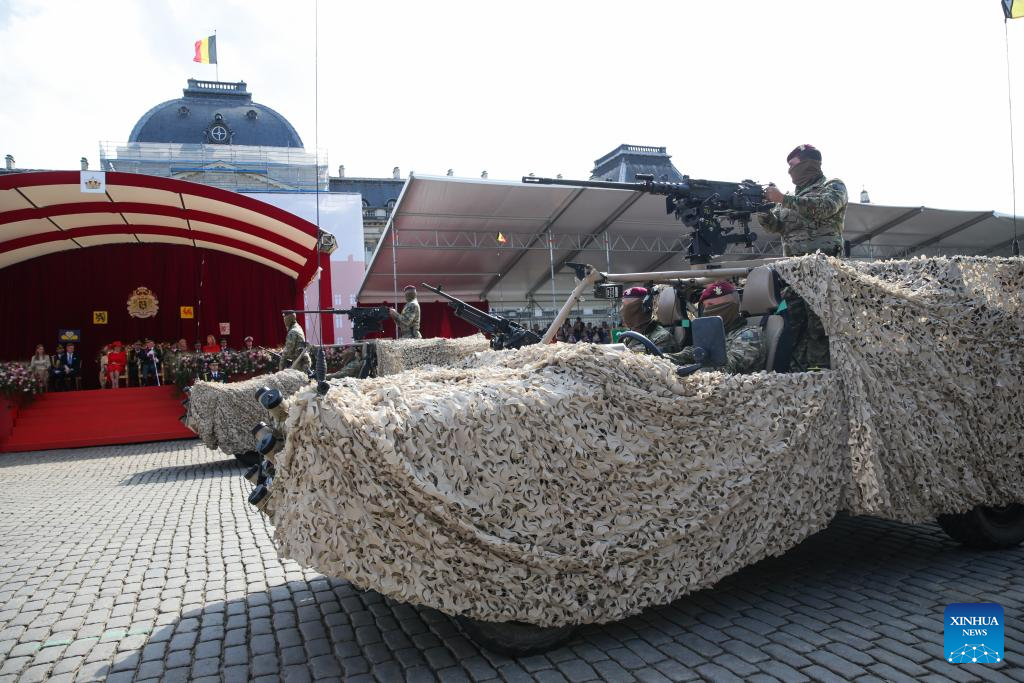 Military vehicles run during a military and citizens' parade of Belgian National Day celebrations in Brussels, Belgium, on July 21, 2023. (Xinhua/Zheng Huansong)