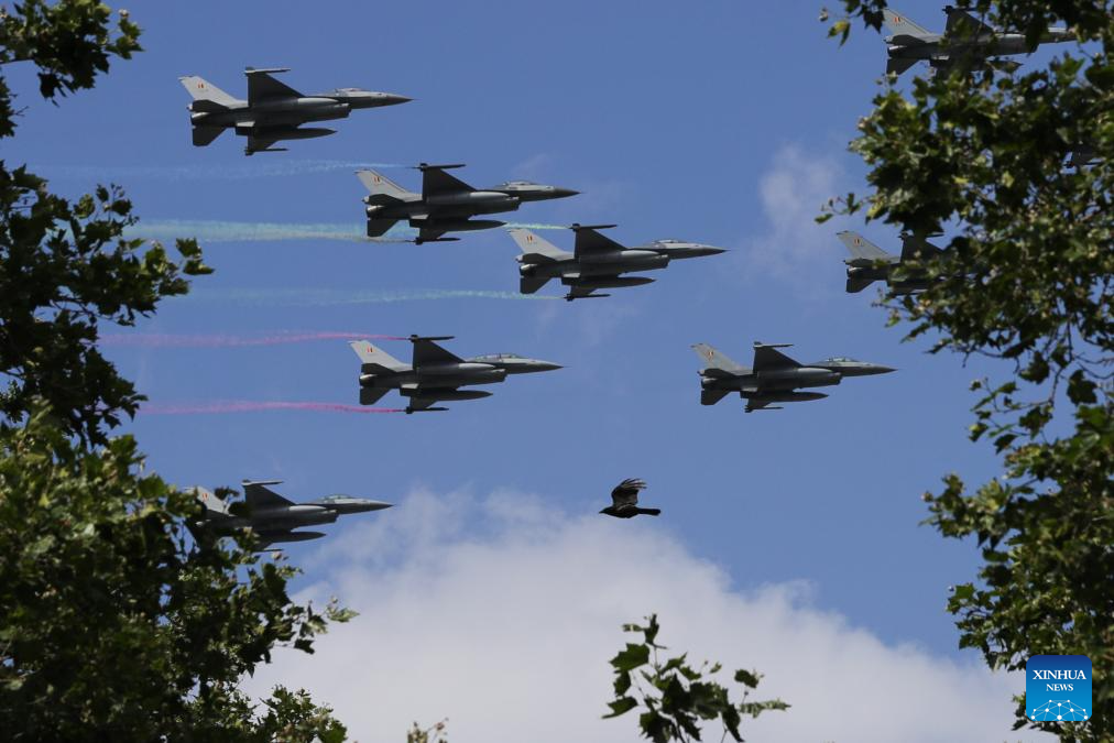 F-16 aircraft fly during a military and citizens' parade of Belgian National Day celebrations in Brussels, Belgium, on July 21, 2023. (Xinhua/Zheng Huansong)
