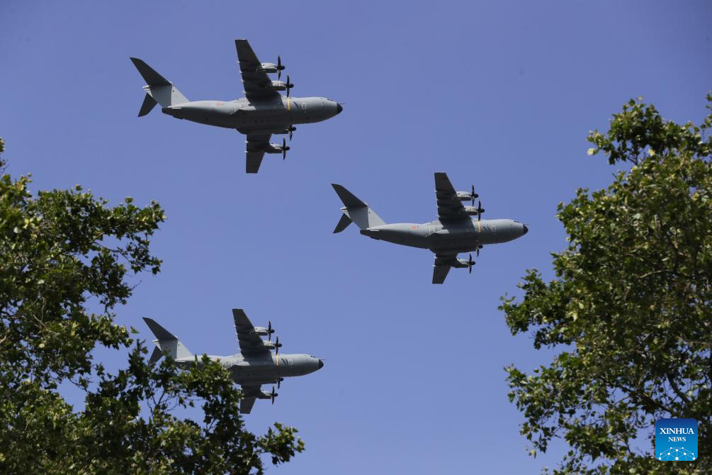A400M transport aircraft fly during a military and citizens' parade of Belgian National Day celebrations in Brussels, Belgium, on July 21, 2023. (Xinhua/Zheng Huansong)