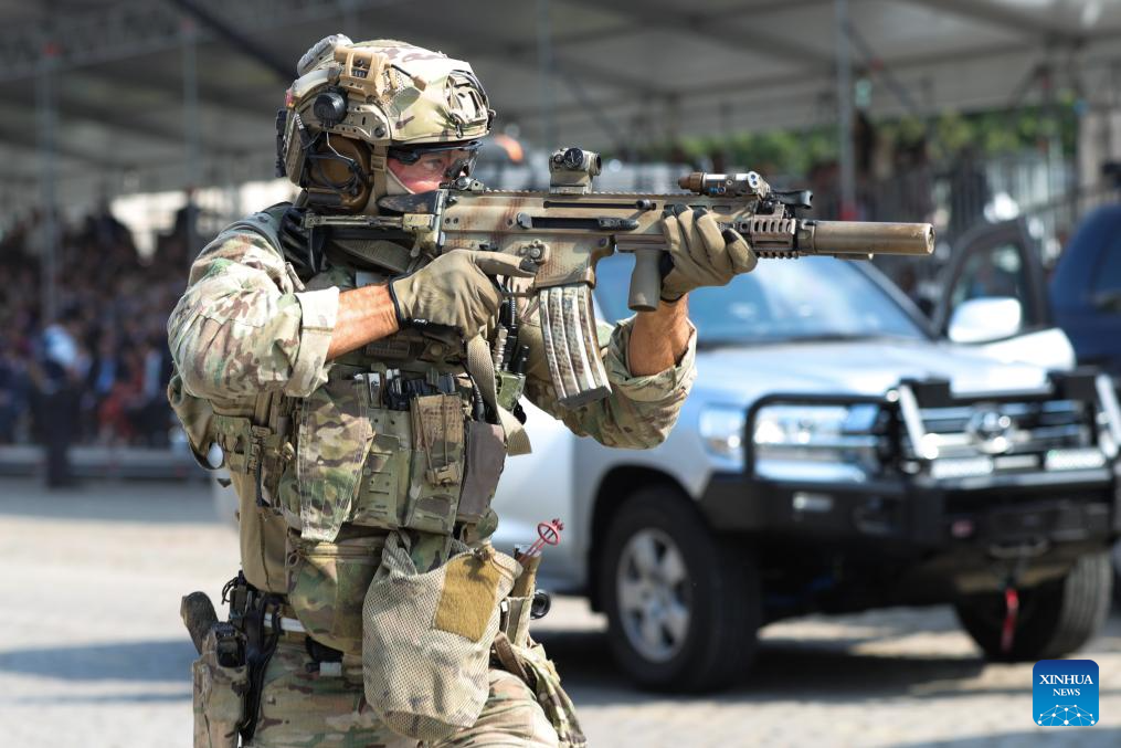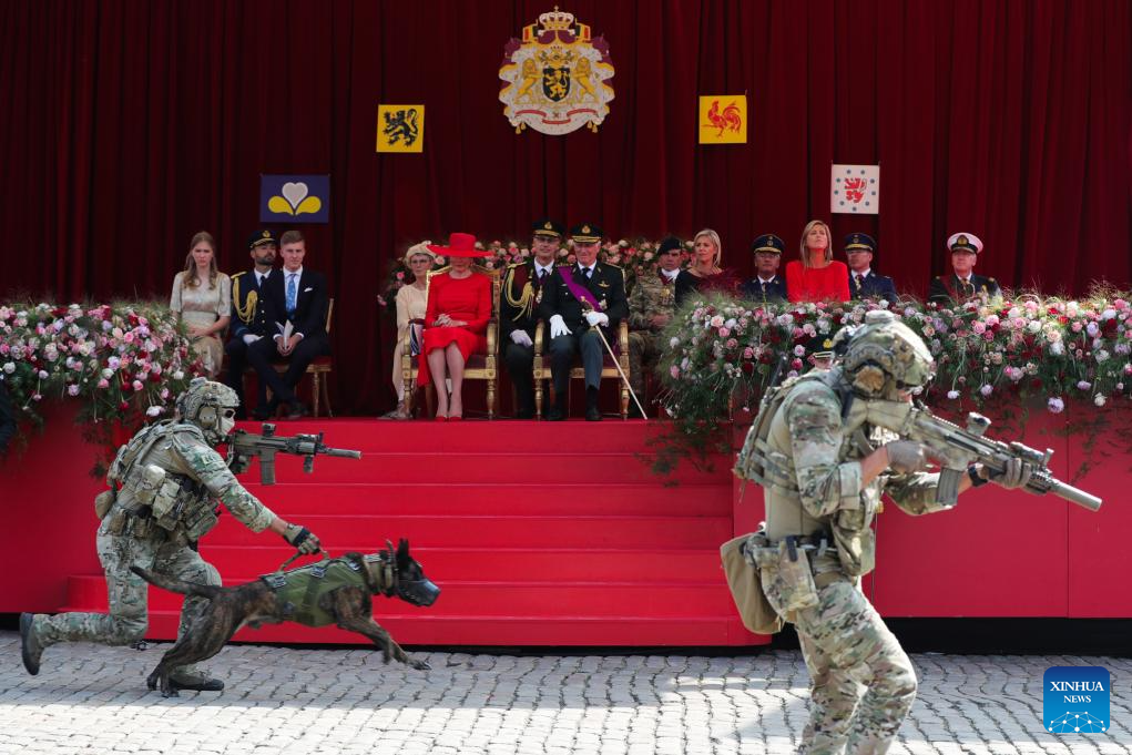 Soldiers demonstrate anti-terrorist skills during a military and citizens' parade of Belgian National Day celebrations in Brussels, Belgium, on July 21, 2023. (Xinhua/Zheng Huansong)
