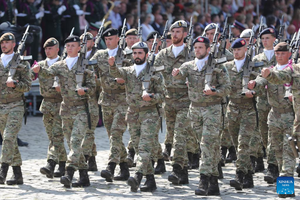 Military personnel march during a military and citizens' parade of Belgian National Day celebrations in Brussels, Belgium, on July 21, 2023. (Xinhua/Zheng Huansong)