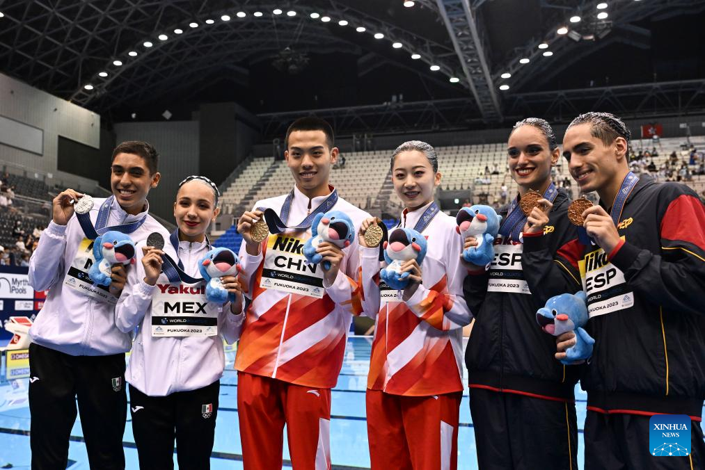 Gold medalists Cheng Wentao (3rd R)/Shi Haoyu (3rd L) of China, silver medalists Itzamary Gonzalez Cuellar (1st L)/Diego Villalobos Carrillo (2nd L) of Mexico and bronze medalists Dennis Gonzalez Boneu (2nd R)/Mireia Hernandez Luna of Spain pose during the awarding ceremony for the mixed duet free final of artistic swimming at the World Aquatics Championships in Fukuoka, Japan, July 22, 2023. (Xinhua/Xu Chang)