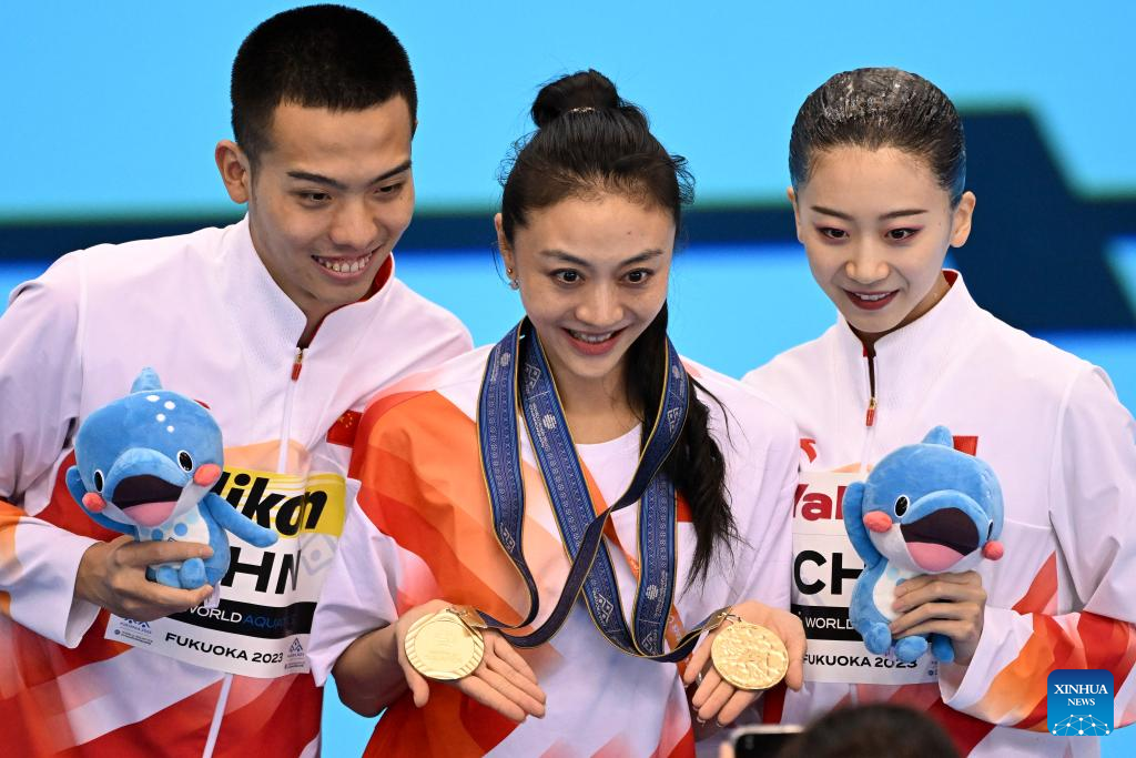 Shi Haoyu (L)/Cheng Wentao (R) of China pose with their coach Ana Tarres Campa after the awarding ceremony for during the mixed duet free final of artistic swimming at the World Aquatics Championships in Fukuoka, Japan, July 22, 2023. (Xinhua/Xu Chang)